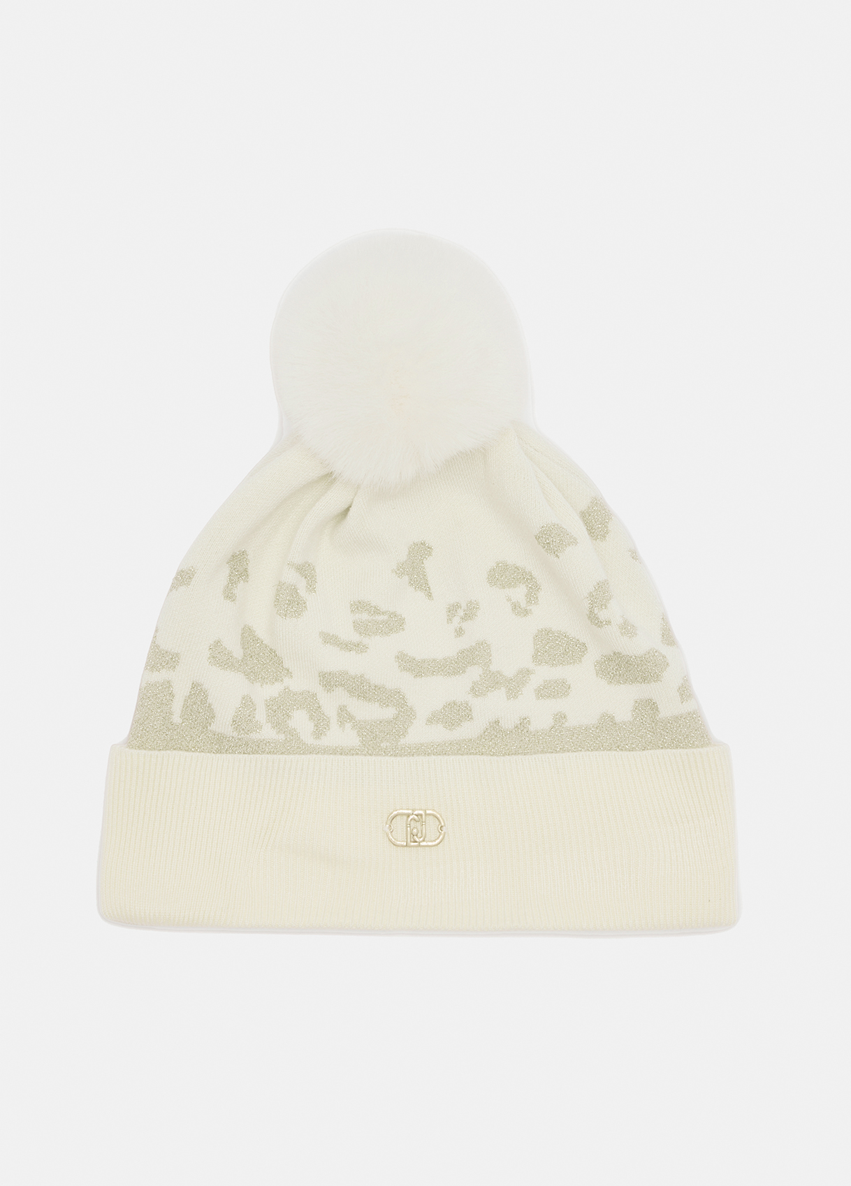 Berretto beanie bianco in maglia ecosostenibile di misto viscosa e lurex®, arricchito da motivo animalier jacquard e pompon in tono. Presenta risvolto a costine e logo in metallo sul davanti. Un accessorio caldo e trendy, perfetto per completare i tuoi look invernali con un tocco glam.