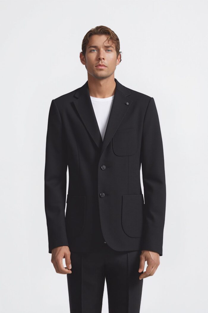 Blazer uomo dal taglio regular fit, realizzato in tessuto texturizzato che garantisce comfort e stile. Presenta revers classici, chiusura frontale a due bottoni, tasche applicate e taschino sul petto. Un capo versatile e raffinato, ideale per look casual chic o abbinamenti eleganti.