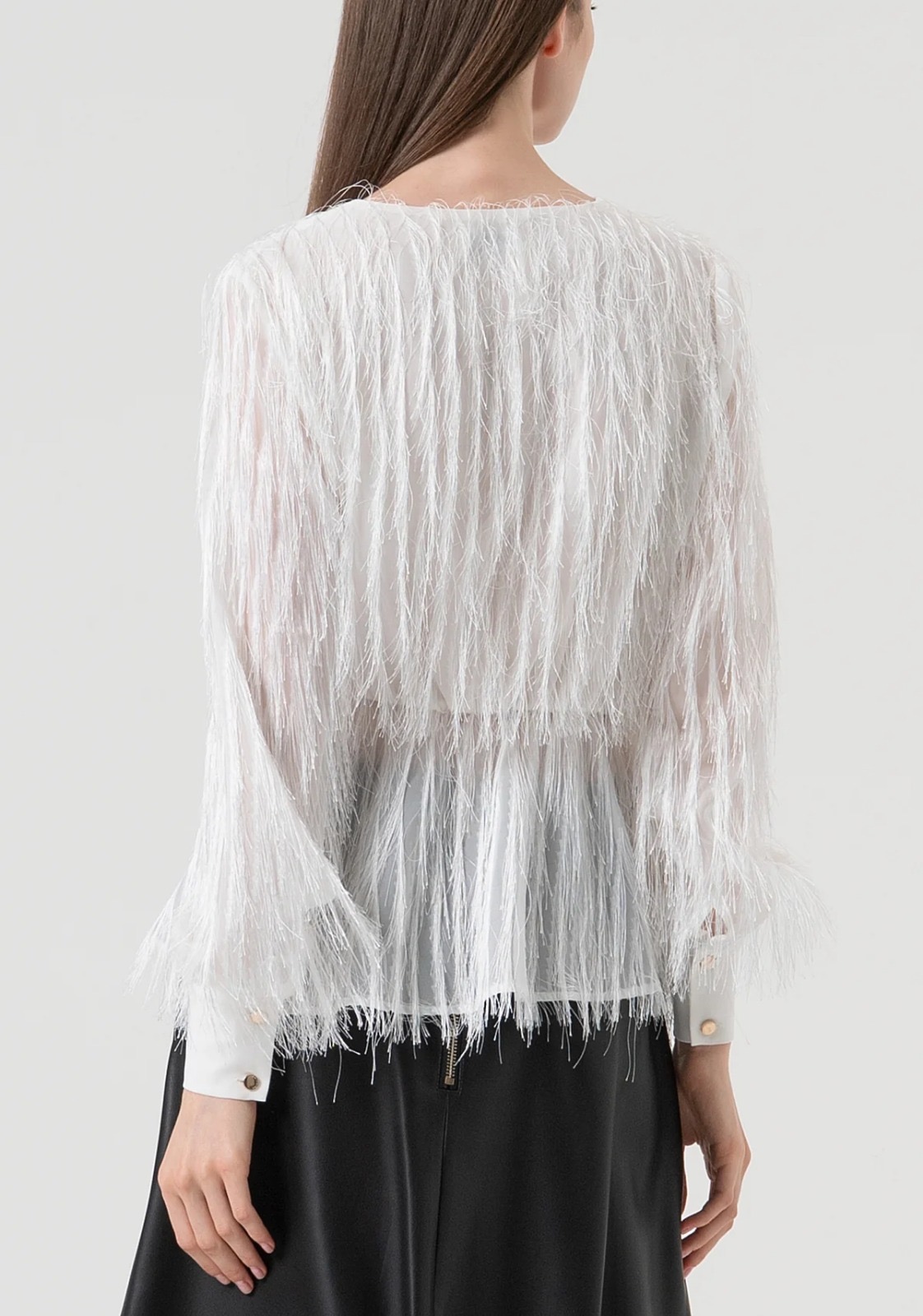 Blusa elegante in fil coupé, perfetta per look raffinati e femminili. Il design presenta scollo incrociato che valorizza il décolleté e maniche lunghe dal taglio fluido, ideali per dare movimento al capo. La vestibilità regular fit assicura comfort e stile in ogni occasione.