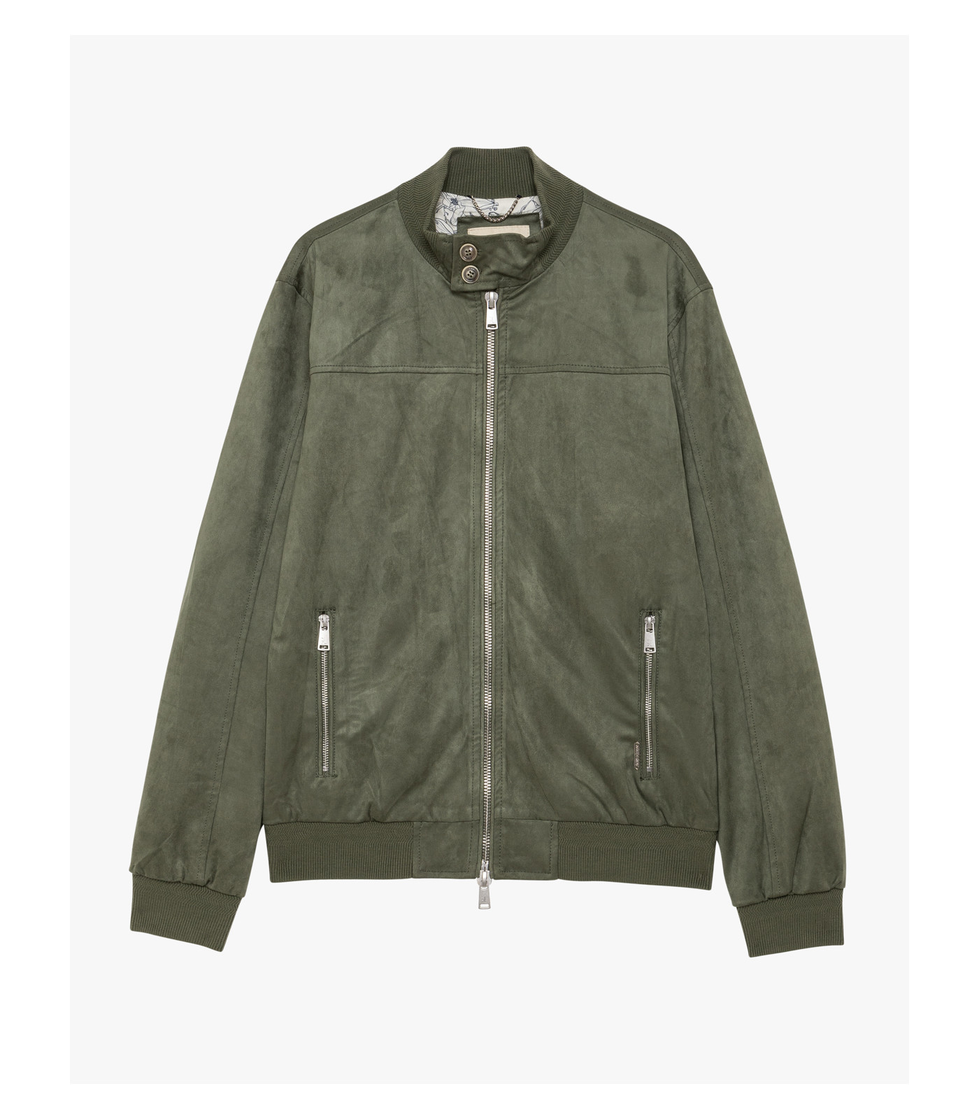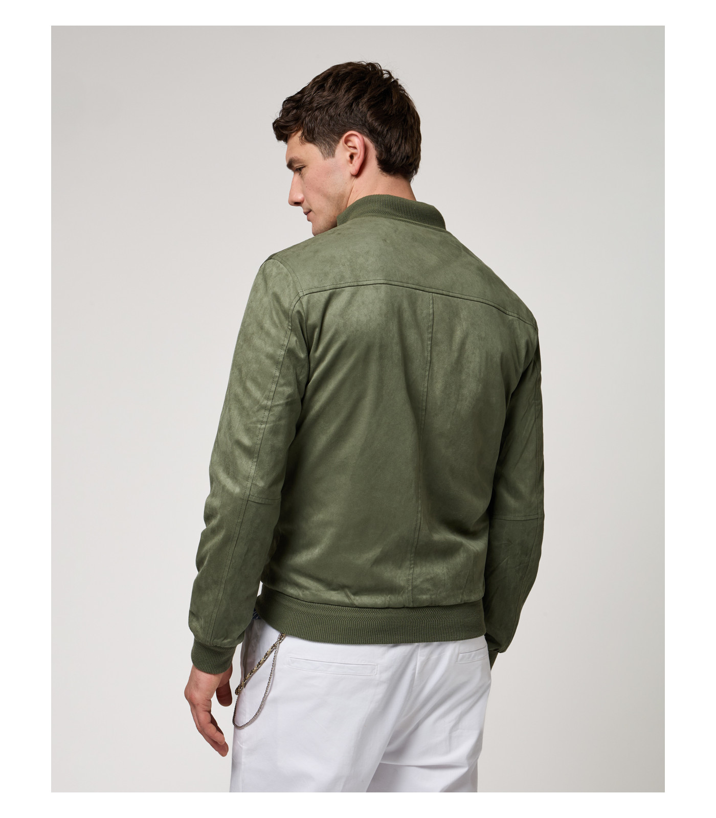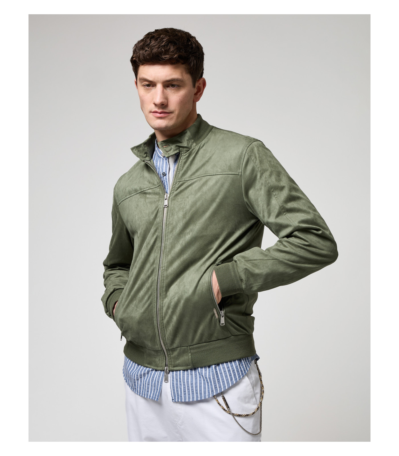Bomber da uomo in tessuto effetto camoscio, dal design versatile e moderno. La vestibilitร regular fit garantisce comfort e libertร di movimento. Caratterizzato da collo a imbuto con bottoni, chiusura frontale con zip, tasche laterali con zip e una tasca interna con zip per maggiore praticitร . Un capo ideale per la mezza stagione, dallo stile casual ma raffinato.