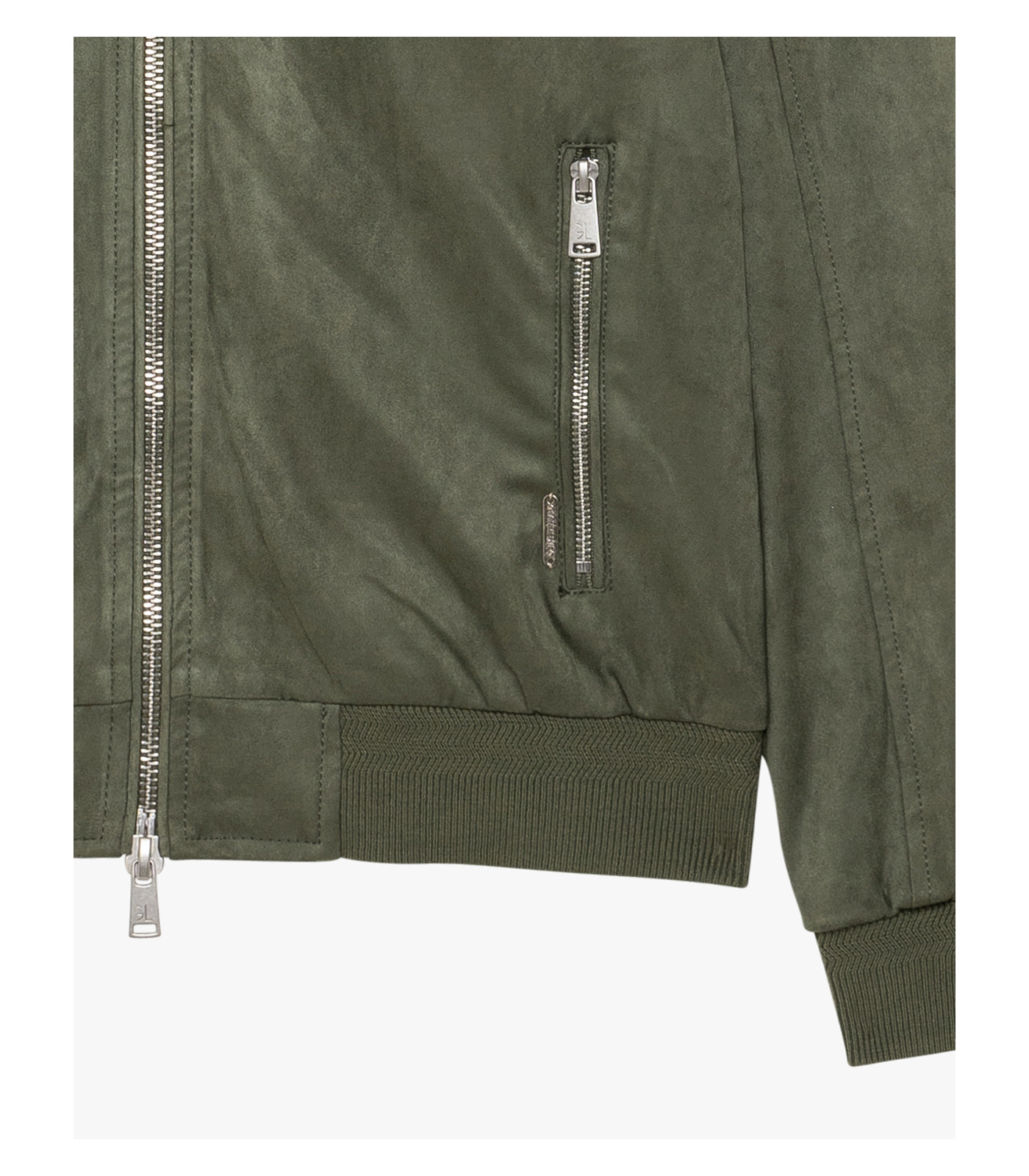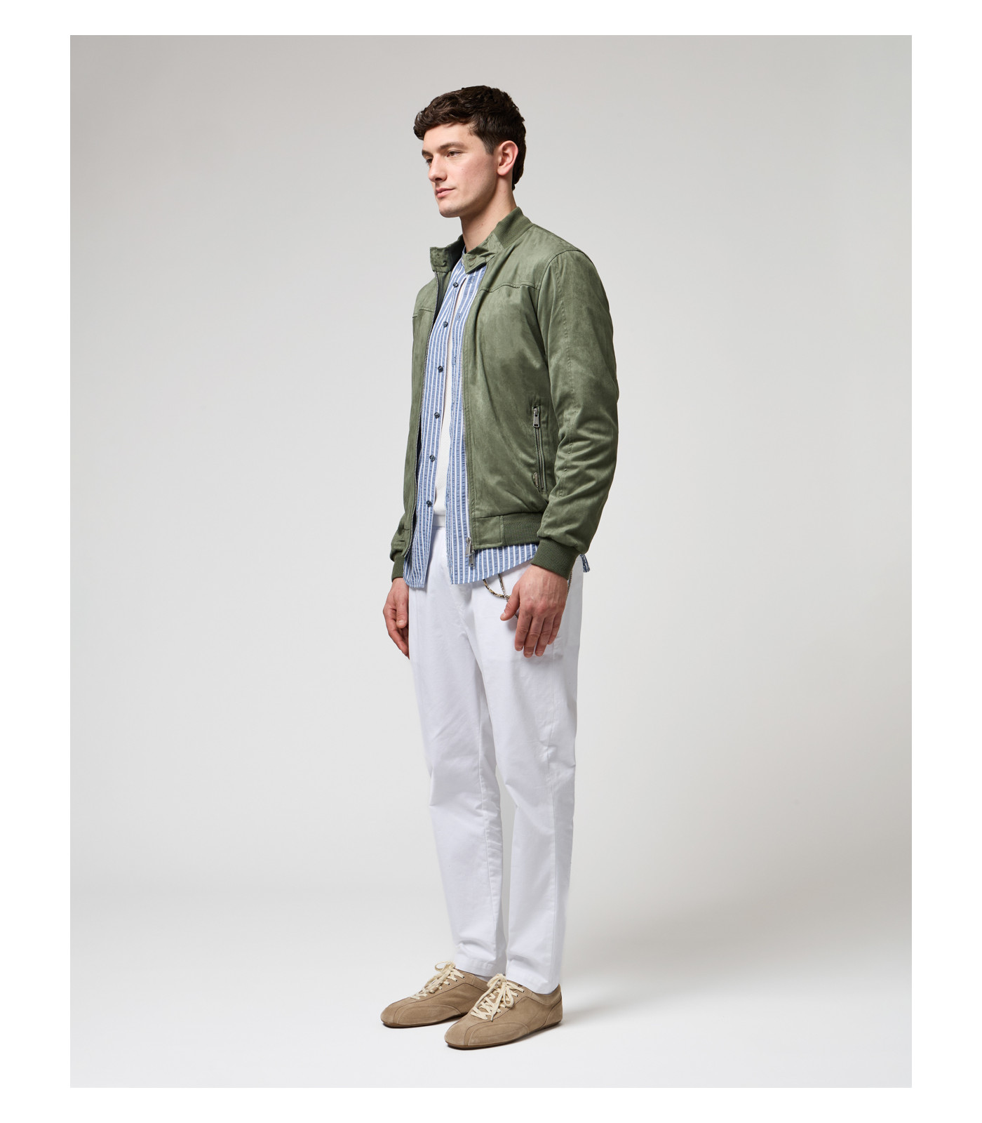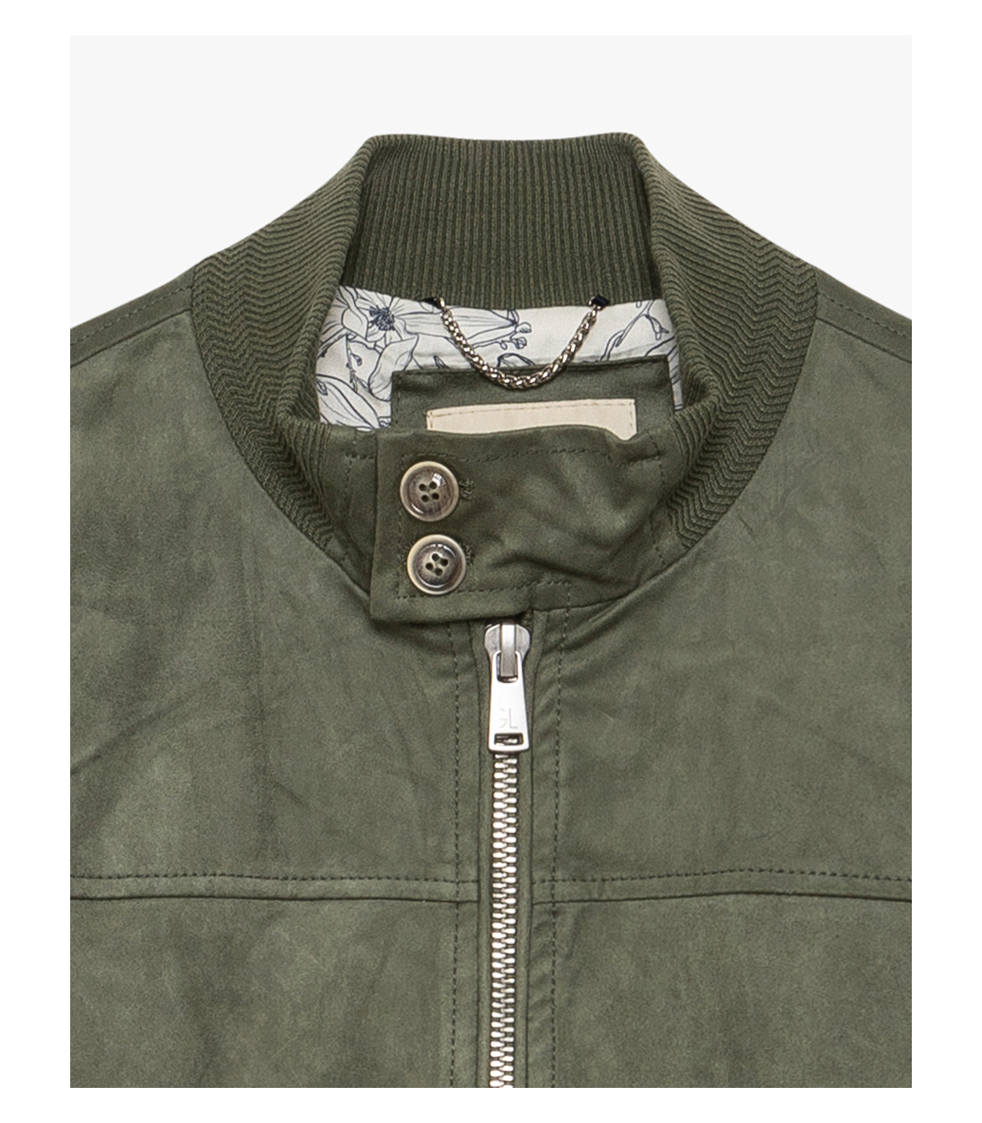 Bomber da uomo in tessuto effetto camoscio, dal design versatile e moderno. La vestibilitร regular fit garantisce comfort e libertร di movimento. Caratterizzato da collo a imbuto con bottoni, chiusura frontale con zip, tasche laterali con zip e una tasca interna con zip per maggiore praticitร . Un capo ideale per la mezza stagione, dallo stile casual ma raffinato.