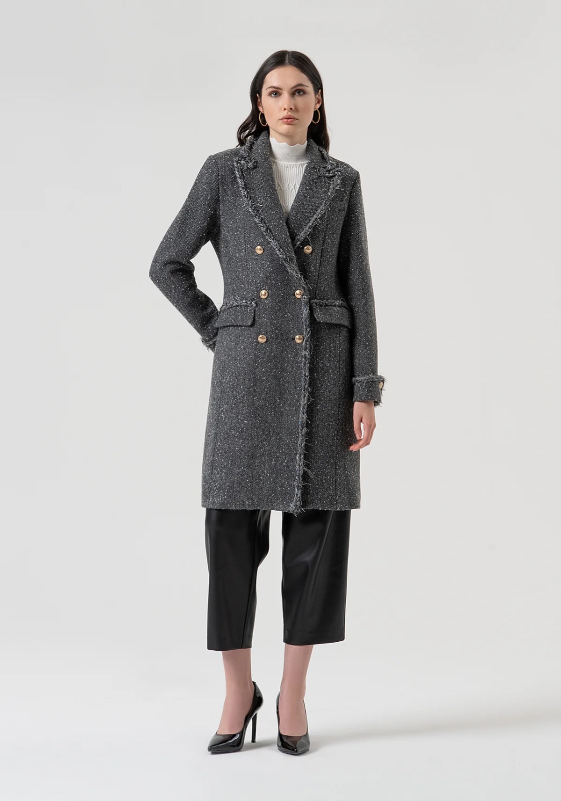 Elegante cappotto lungo slim fit in tweed grigio melange, perfetto per i look urbani e sofisticati della stagione AI25. Caratterizzato da design doppiopetto con rever a lancia arricchito da passamaneria, tasche con patta e maniche lunghe. La vestibilità slim valorizza la silhouette mantenendo uno stile raffinato e contemporaneo. Realizzato con tessuti di qualità : esterno in acrilico 70%, poliestere 20% e lana 10%, con fodera interna in poliestere 100% per garantire comfort e resistenza.