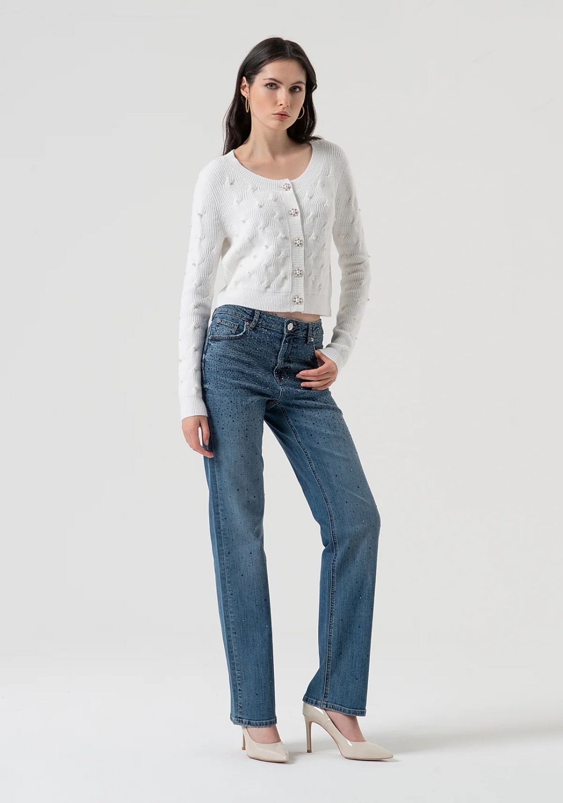 Cardigan a trecce dalla vestibilità regolare, ideale per look raffinati e versatili. Presenta scollo tondo, maniche lunghe e apertura frontale con eleganti bottoni gioiello che donano un tocco luminoso. Realizzato in un morbido mix di viscosa, poliestere e nylon, assicura comfort e calore senza rinunciare allo stile. Perfetto da indossare su jeans, pantaloni sartoriali o gonne per outfit casual chic o da occasione.