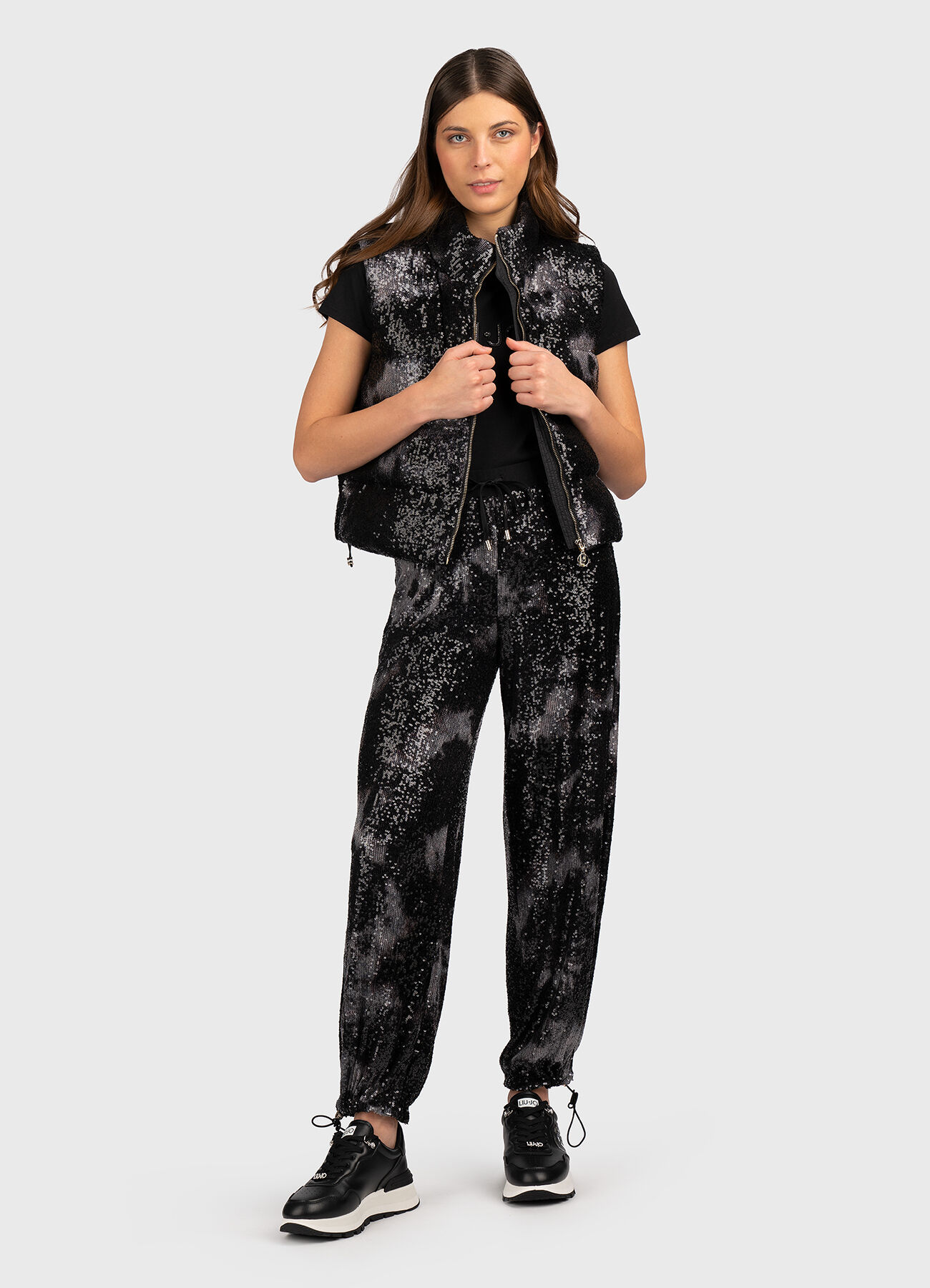 Gilet imbottito dal design glamour e contemporaneo, impreziosito da luminose paillettes applicate che donano brillantezza e carattere ad ogni look. Leggero ma caldo, è perfetto da sovrapporre a maglie o felpe per uno stile casual-chic dal forte impatto. Apertura frontale con zip e linea comoda che valorizza la silhouette.