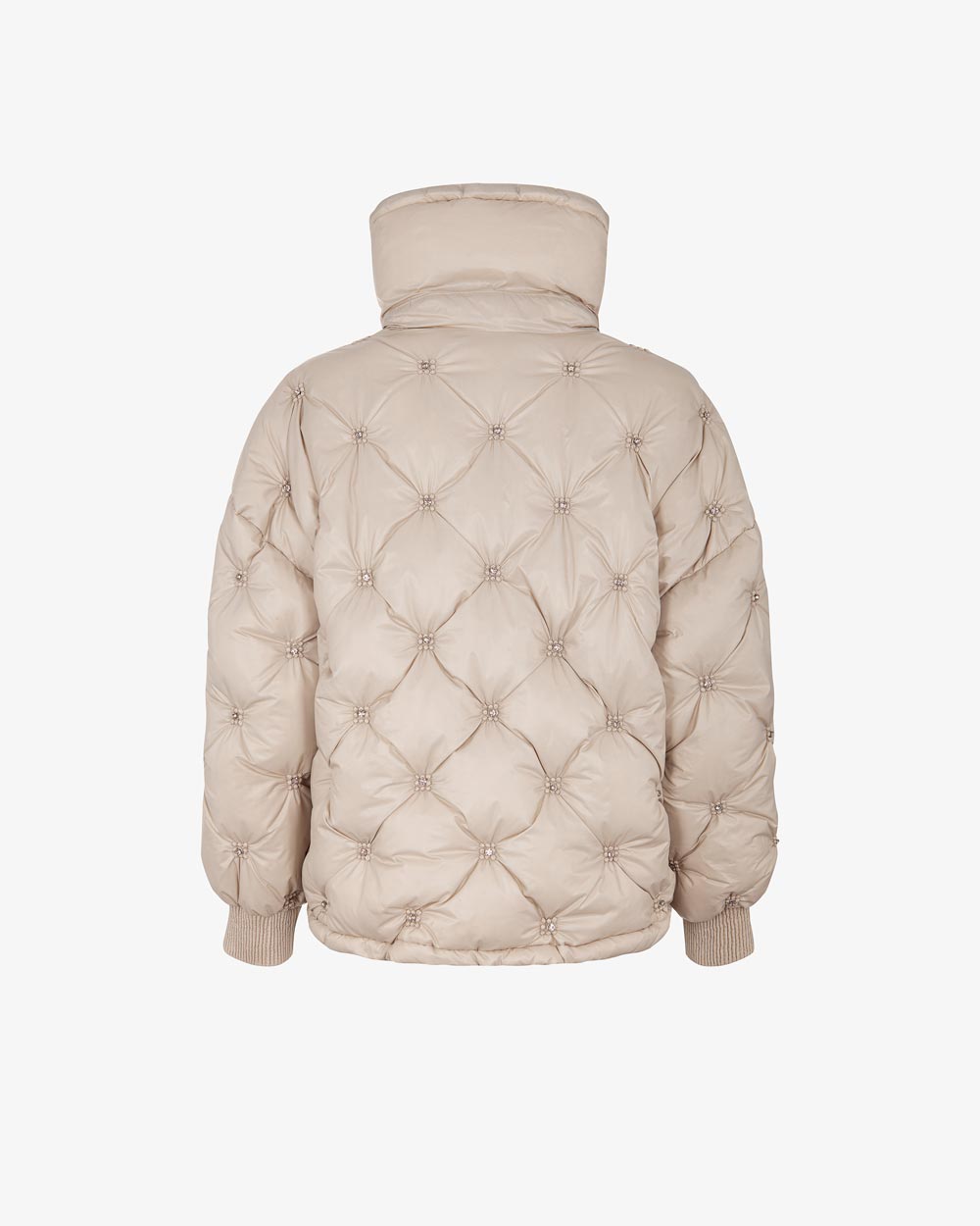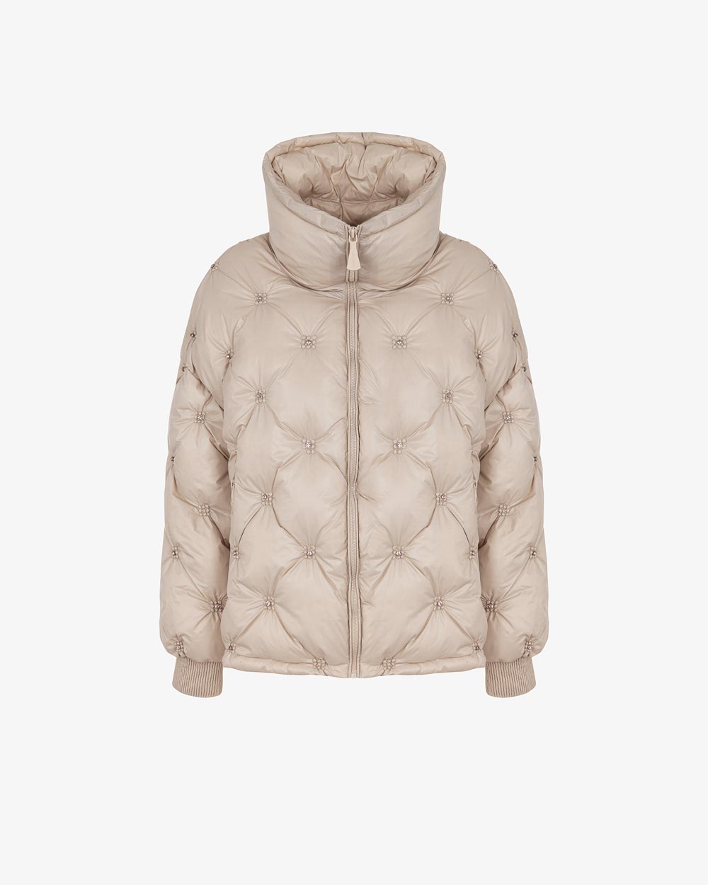 Giubbotto imbottito da donna in nylon beige, caratterizzato da maxi collo avvolgente, maniche lunghe con polsi elasticizzati e pratica chiusura con zip frontale. Dettagli eleganti come strass applicati e inserti decorativi donano luce e raffinatezza al capo. Dotato di tasche frontali con zip e coulisse regolabile sul fondo per una vestibilità personalizzata. Imbottitura in poliestere per garantire comfort e calore.