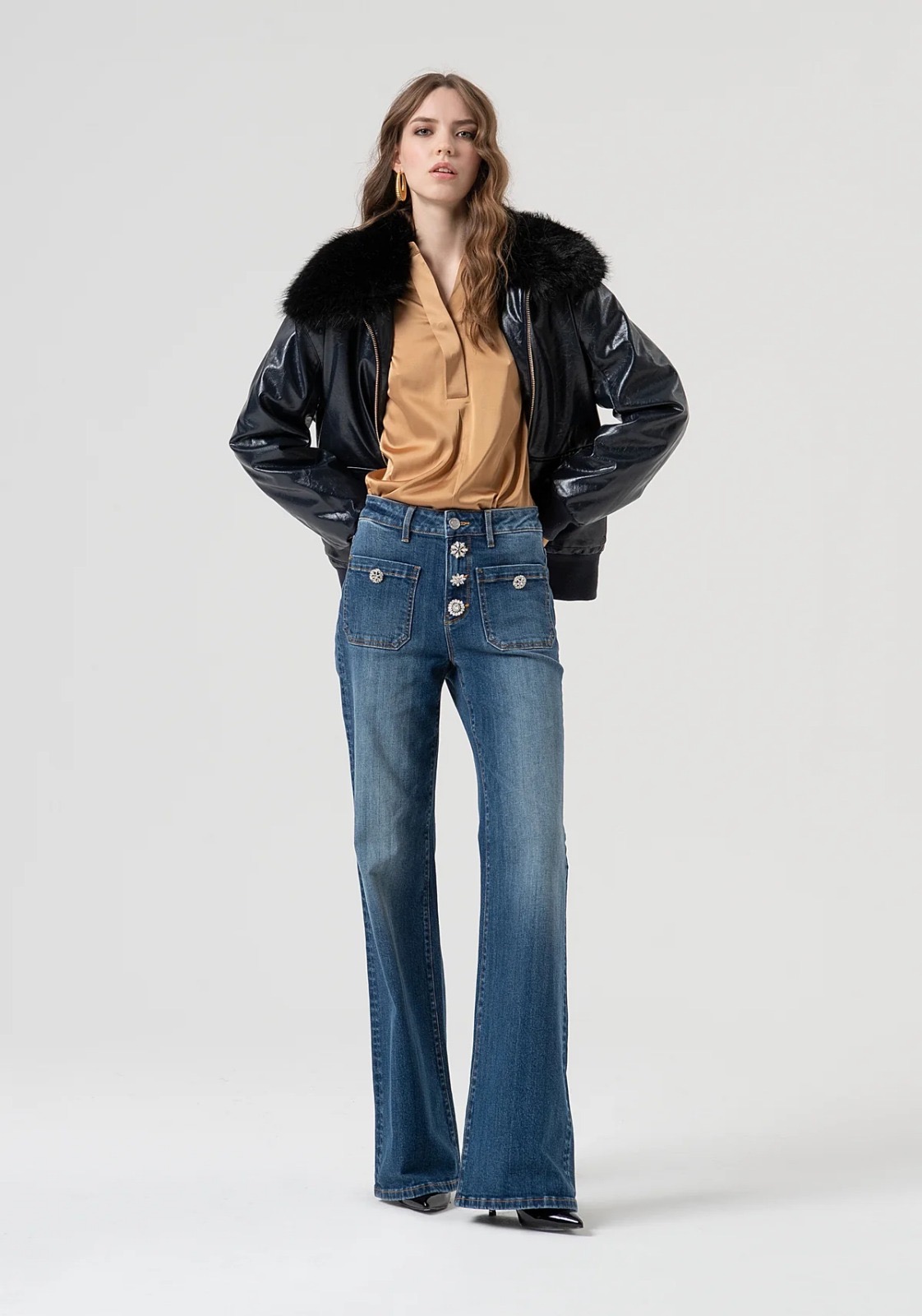 Il modello presenta una vita regolare, arricchita da raffinati bottoni gioiello applicati che aggiungono un tocco chic e distintivo. Le tasche applicate sul davanti donano praticità e un dettaglio retrò, mentre l’ampio fondo gamba a zampa slancia la figura ed esalta lo stile anni ’70, reinterpretato in chiave moderna.