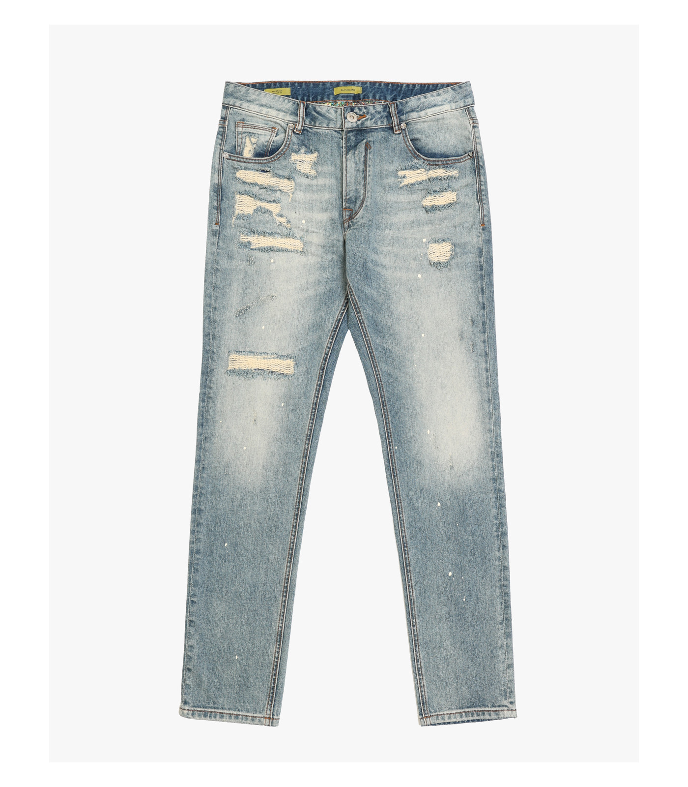 Jeans dal look autentico e grintoso, caratterizzati da vestibilità regular slim fit che unisce comfort e linea moderna. Realizzati in denim blu con lavaggio vintage, presentano dettagli distintivi come baffi, rip&repair, goccioline di vernice e sfumature consumate che donano un aspetto unico e di tendenza. La chiusura è con patta a zip e cinque tasche classiche. Un capo versatile perfetto per outfit casual dal carattere deciso.