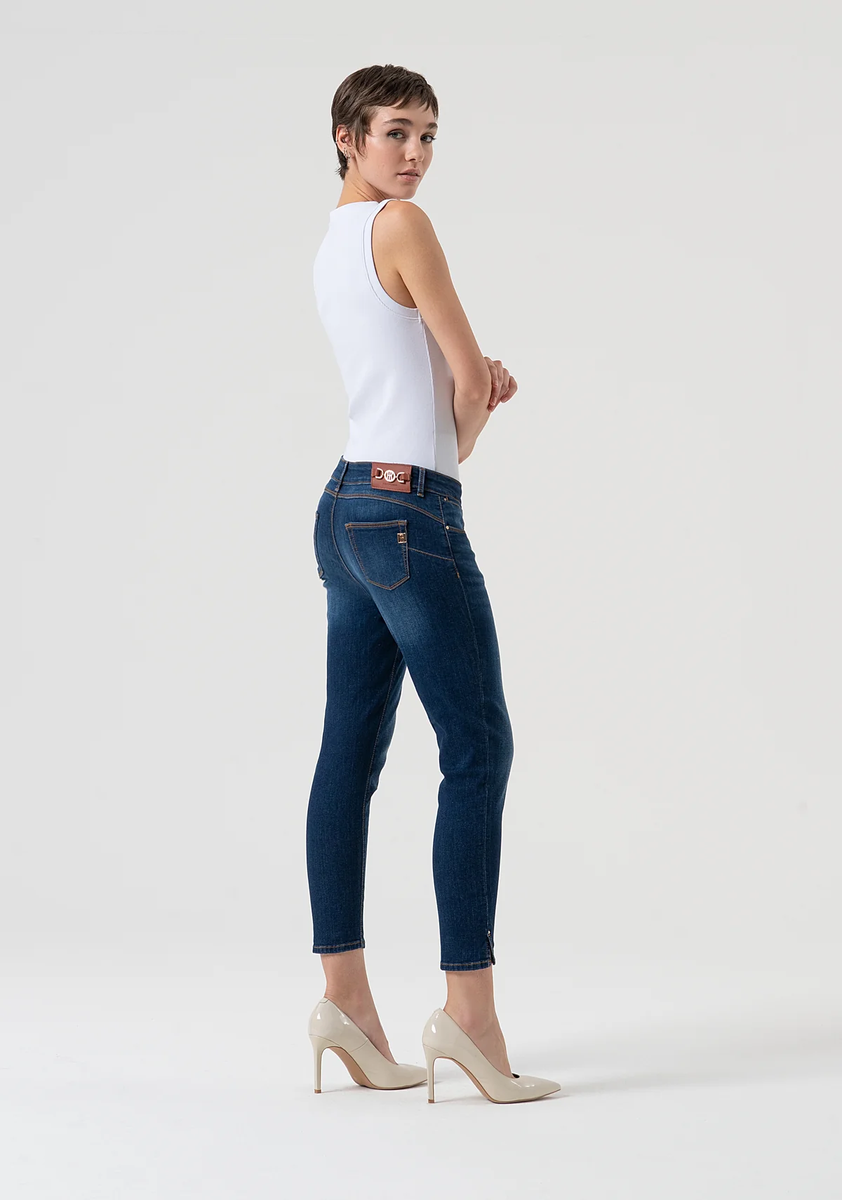 Jeans donna slim cropped in denim con lavaggio medio, caratterizzati da effetto push up che valorizza la silhouette. Vita regolare, modello a 5 tasche e fondo stretto con spacchetto laterale per un tocco moderno e femminile. Perfetti per look streetwear versatili e di tendenza.