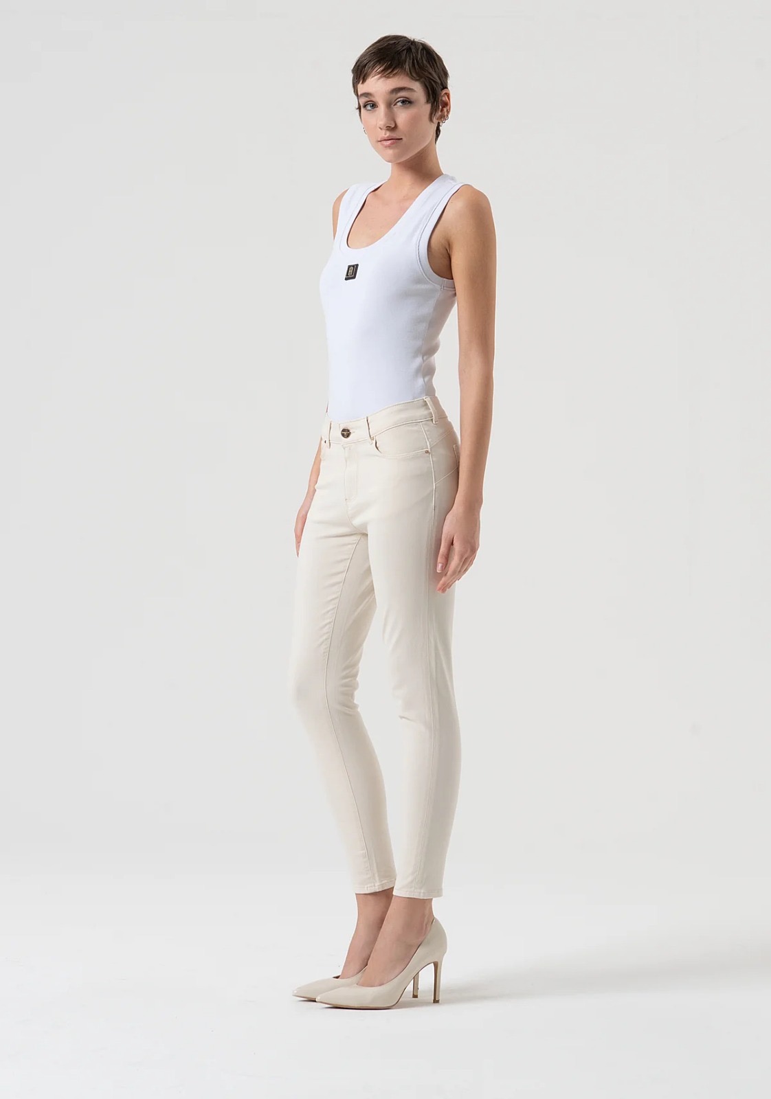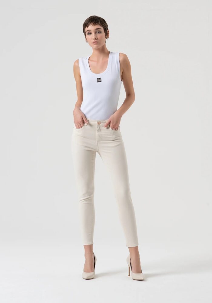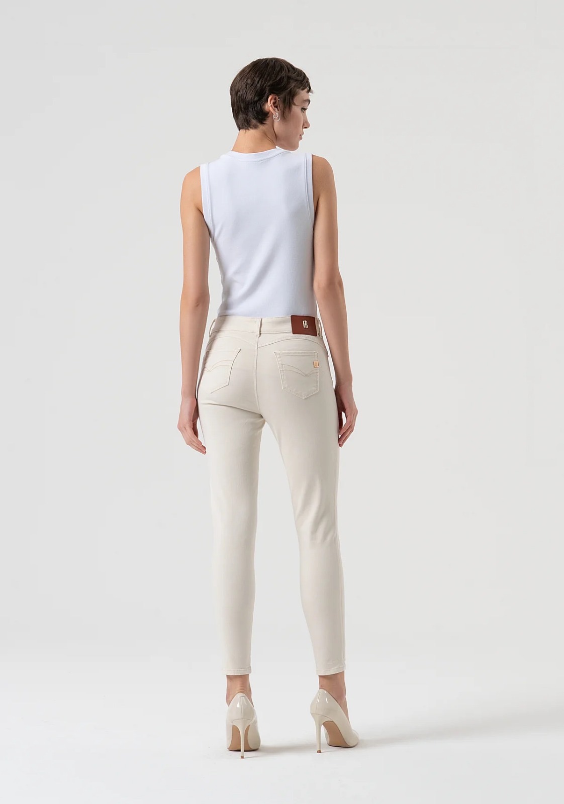 Jeans slim in raso con effetto push up, pensati per valorizzare la silhouette con un tocco elegante e femminile. Realizzati in denim elasticizzato con vita regolare, 5 tasche e fondo stretto, offrono comfort e vestibilità aderente. Il colore vanilla dona luminosità e versatilità , perfetto da abbinare a look casual o più raffinati.