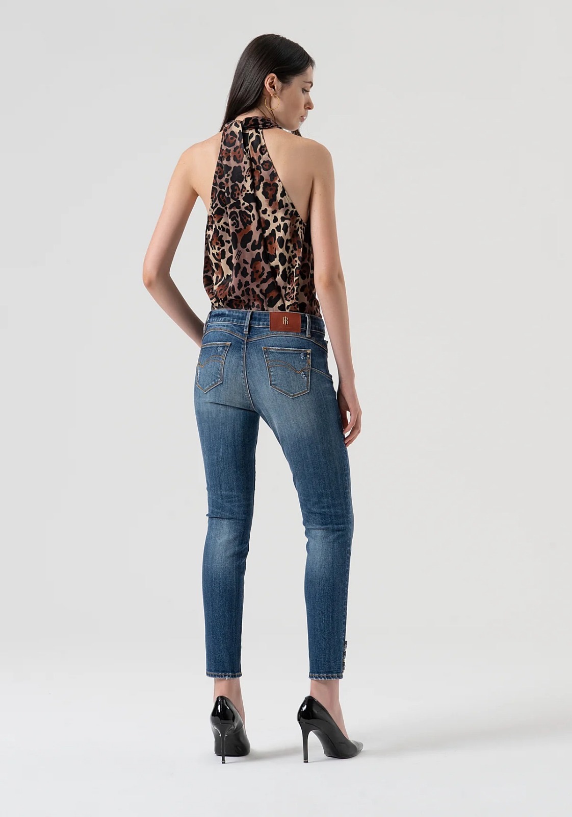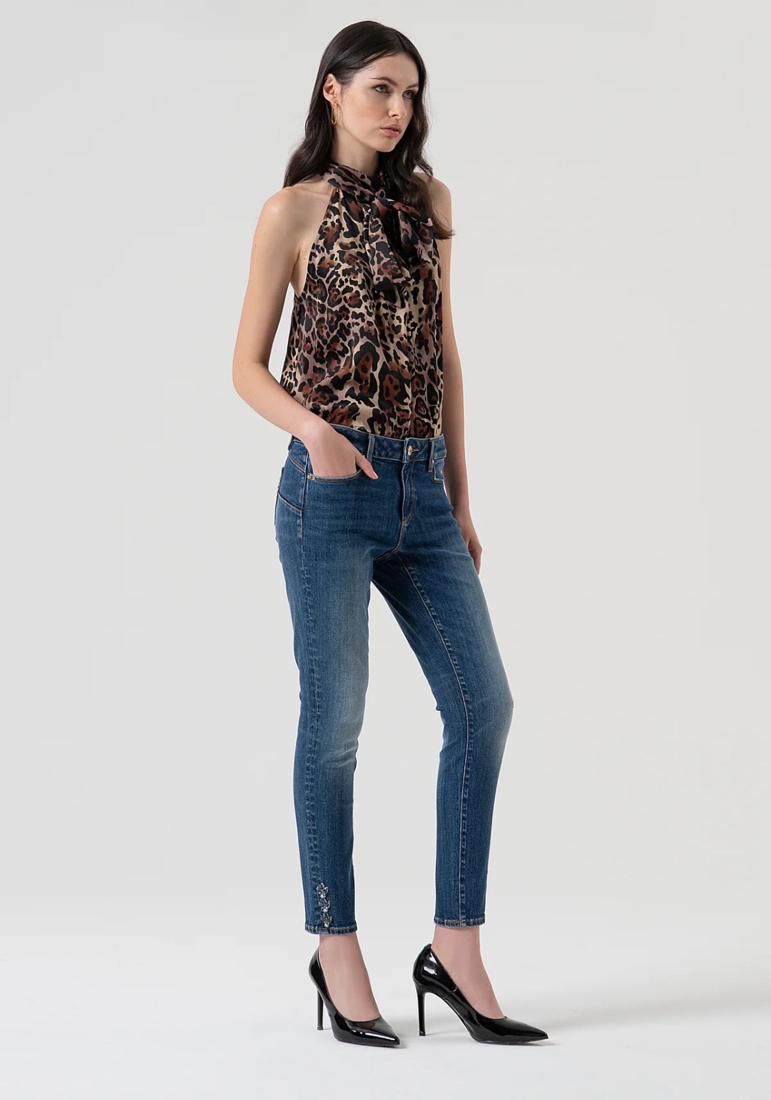 Jeans slim effetto push up in denim con lavaggio medio, pensati per valorizzare la silhouette con un tocco moderno e femminile. Presentano vita regolare, cinque tasche e fondo stretto impreziosito da pietre luminose che donano luce ed eleganza al capo. La vestibilità slim unisce comfort e stile, perfetta per un look urban versatile da giorno e da sera.