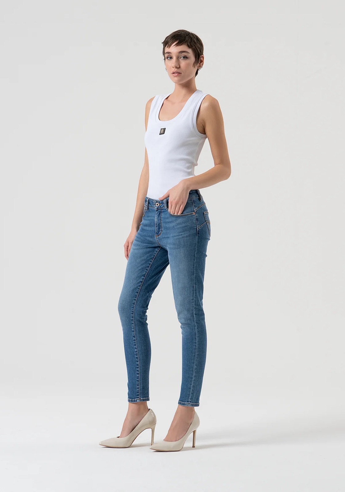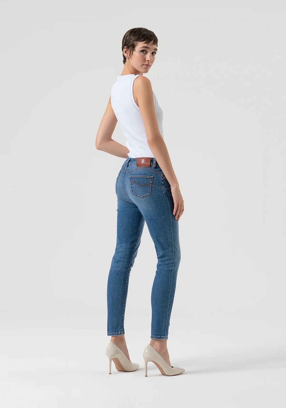 Jeans slim fit con effetto push-up, realizzati in denim elasticizzato con lavaggio medio chiaro. Presentano vita regolare, cinque tasche e fondo gamba aderente che valorizza la silhouette con un tocco moderno e urbano. Parte della linea FR DENIM PREVIEW (collezione AI25), questi jeans sono un must-have versatile e di tendenza.