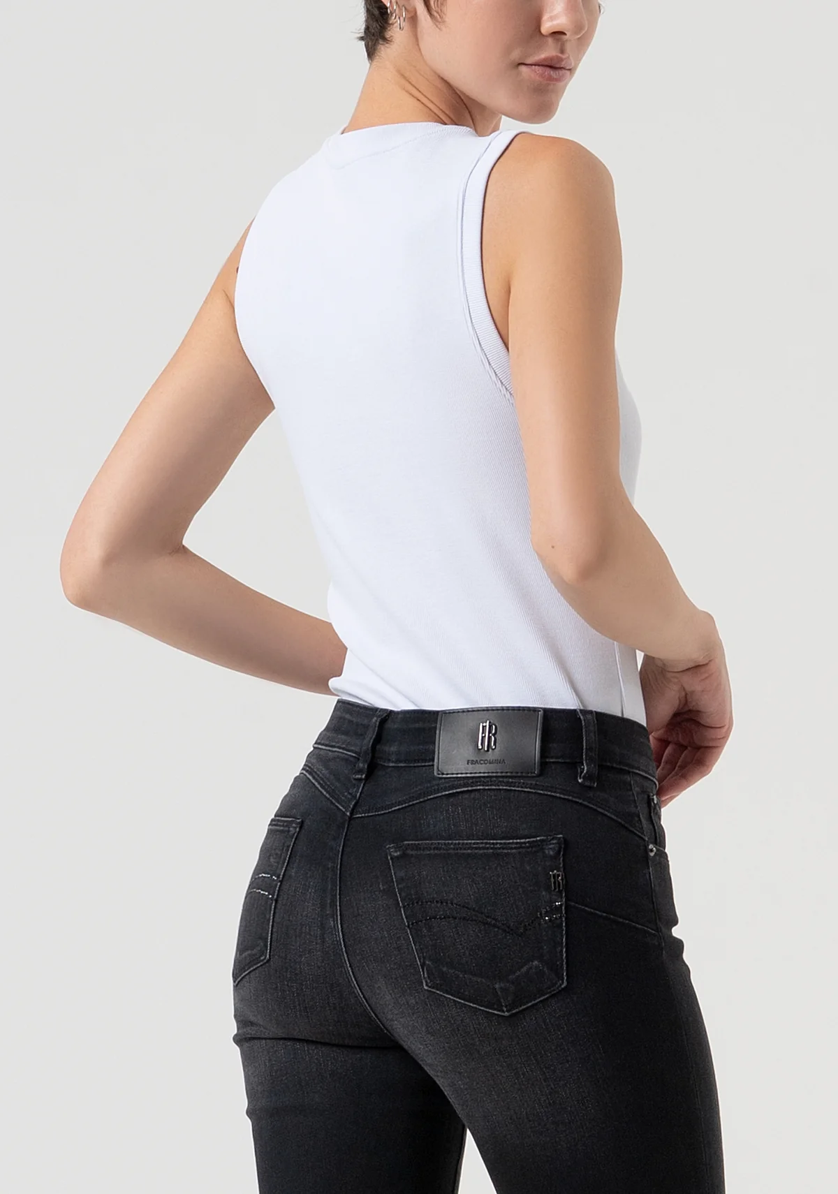 Jeans slim in denim nero con lavaggio vintage, caratterizzati da un effetto push up che valorizza la silhouette. A vita regolare, con 5 tasche e fondo stretto, sono il capo perfetto per un look rock-chic versatile e femminile. Realizzati in tessuto stretch per garantire comfort e aderenza, ideali per outfit casual o serate glam.