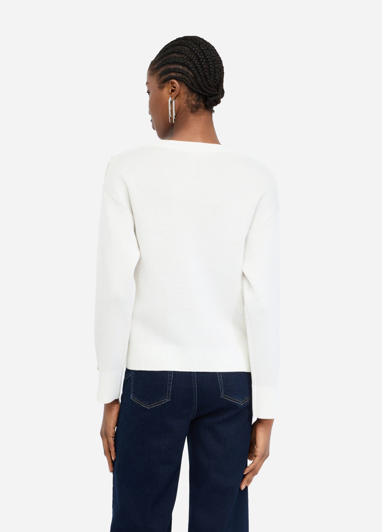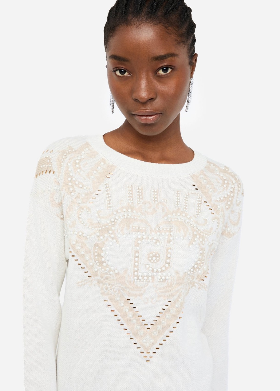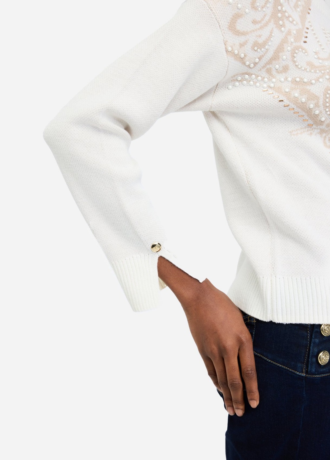 Maglia in misto lana dal design sofisticato, arricchita da motivo jacquard illuminato da borchie e strass. Presenta scollo rotondo, maniche lunghe con polsi rifiniti da piccolo spacchetto e bottone, bordi a costine per una vestibilitร confortevole e femminile. Un capo versatile e chic, ideale per look raffinati dal tocco luminoso.