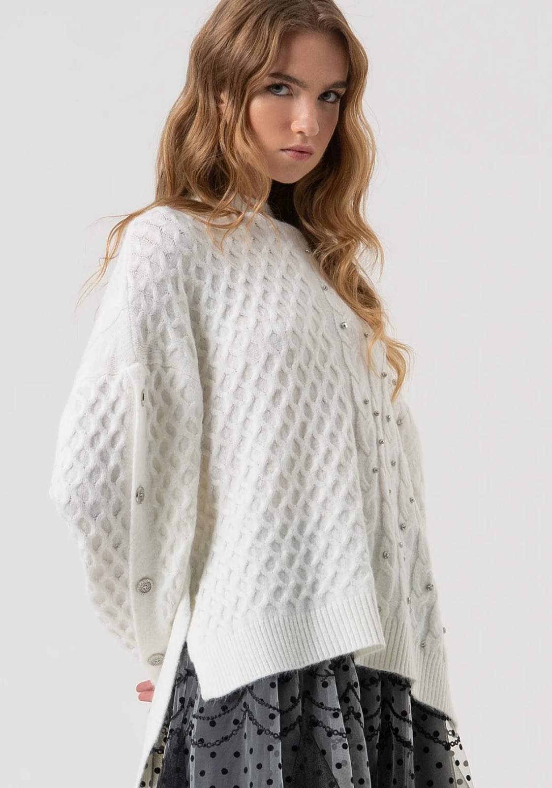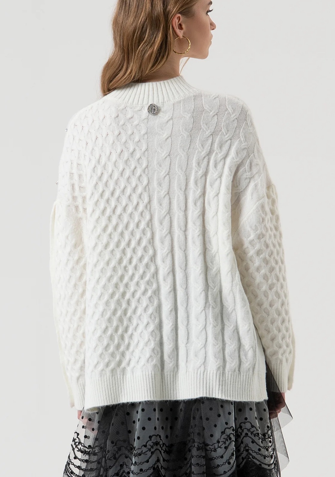 Maglia over firmata Fracomina, caratterizzata da lavorazione a punto treccia e arricchita da eleganti pietre luminose applicate. Presenta collo alto, retro più lungo che dona movimento e maniche lunghe ampie con bottoni laterali decorativi. Un capo urban chic ideale per la stagione autunno/inverno, capace di unire comfort e stile sofisticato.