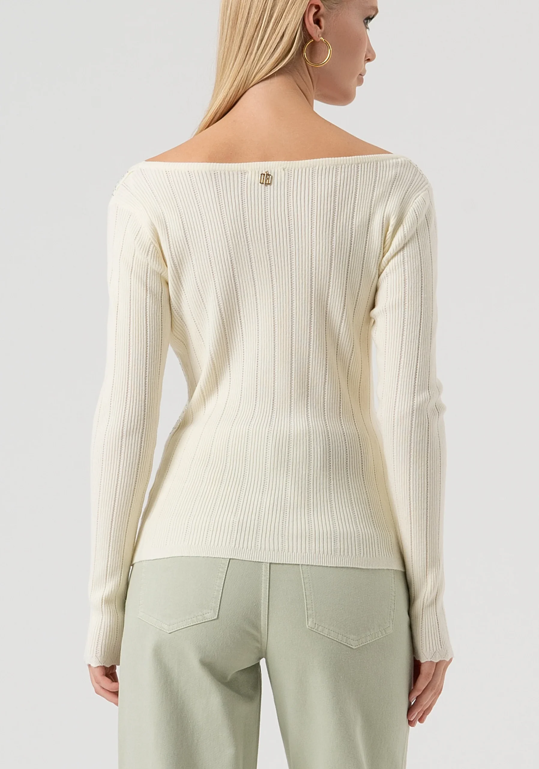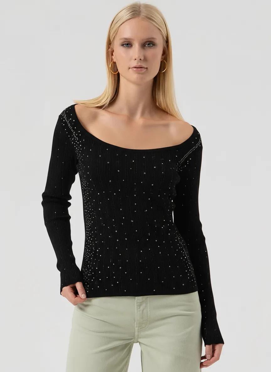 Maglia slim fit in tessuto a costine, impreziosita da dettagli di strass per un tocco luminoso ed elegante. Presenta scollo Madonna che valorizza la scollatura e maniche lunghe che donano femminilità e raffinatezza. Un capo versatile ideale per occasioni serali e look ricercati.