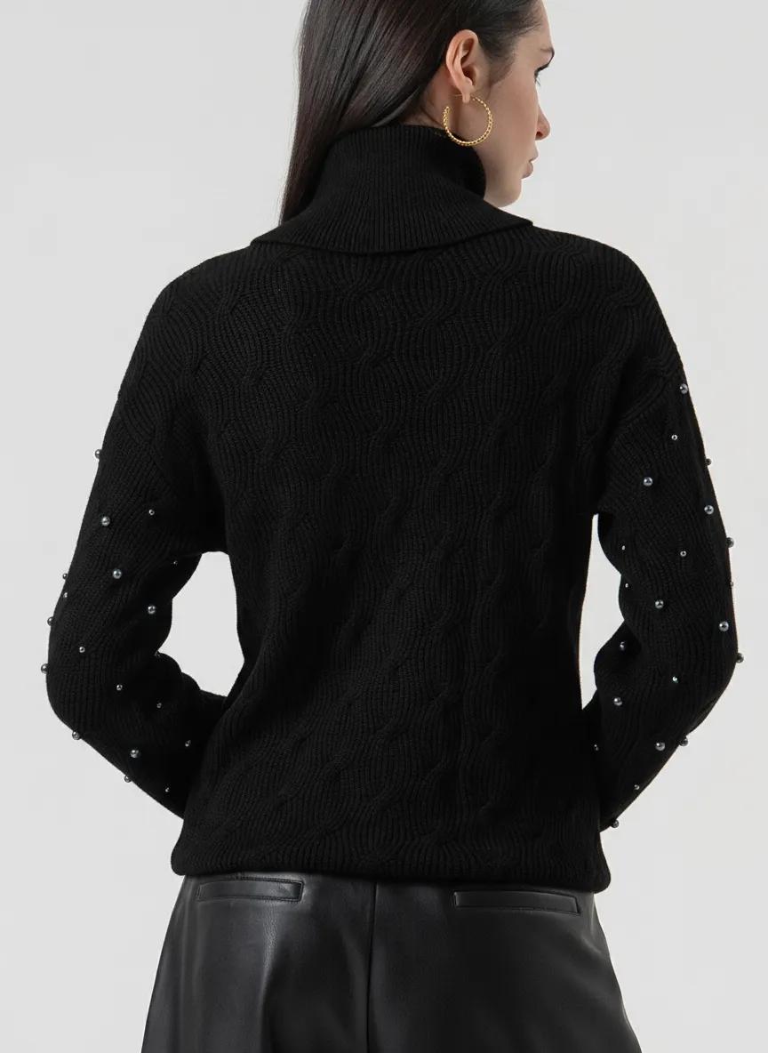 Maglieria elegante e raffinata in regular fit, impreziosita da lavorazione a trecce e applicazioni di perle. Presenta collo alto e maniche lunghe, perfetta per la stagione Autunno/Inverno 2025. Un capo versatile e chic, ideale da indossare con gonne o pantaloni per un look sofisticato e femminile.