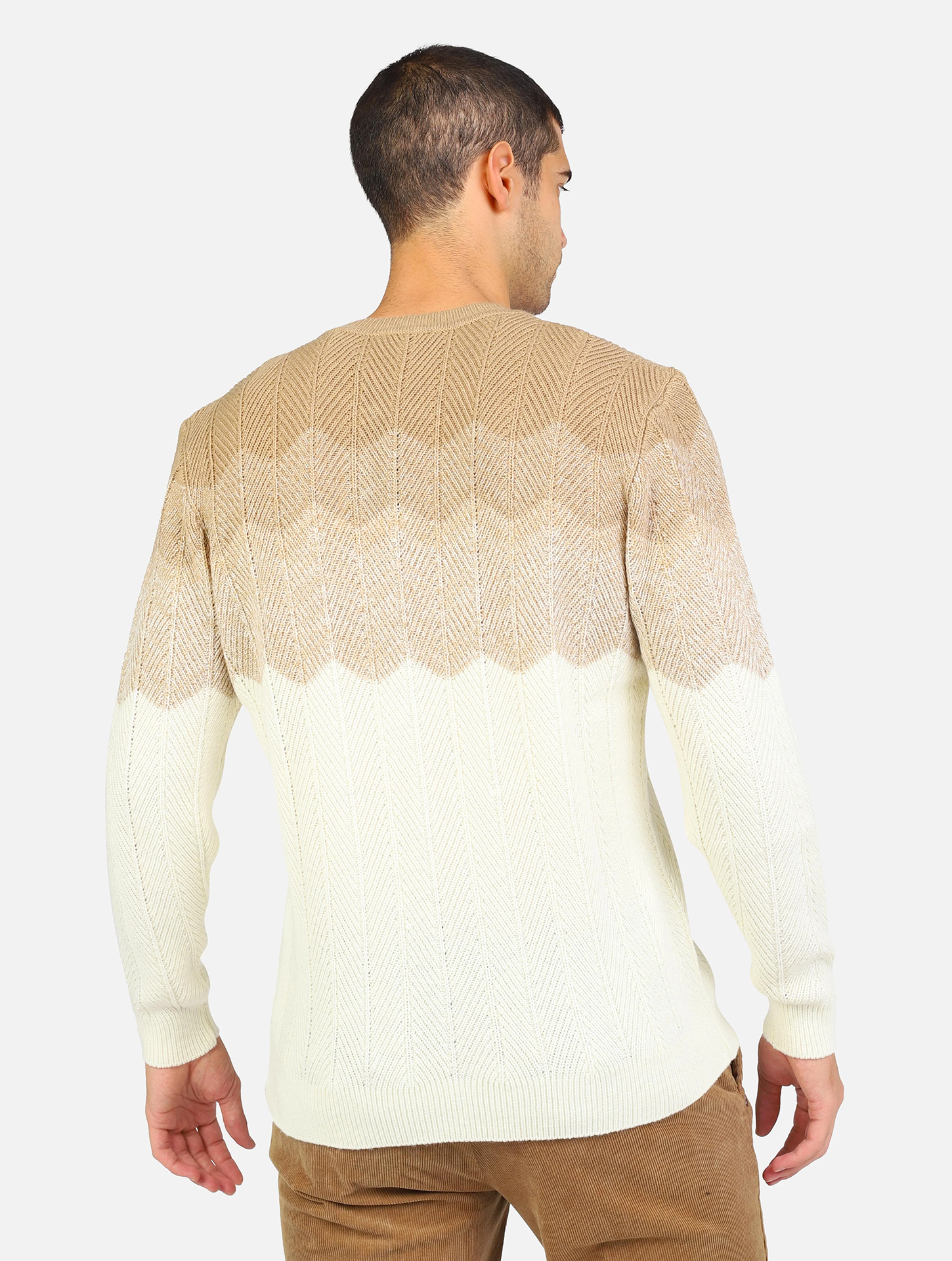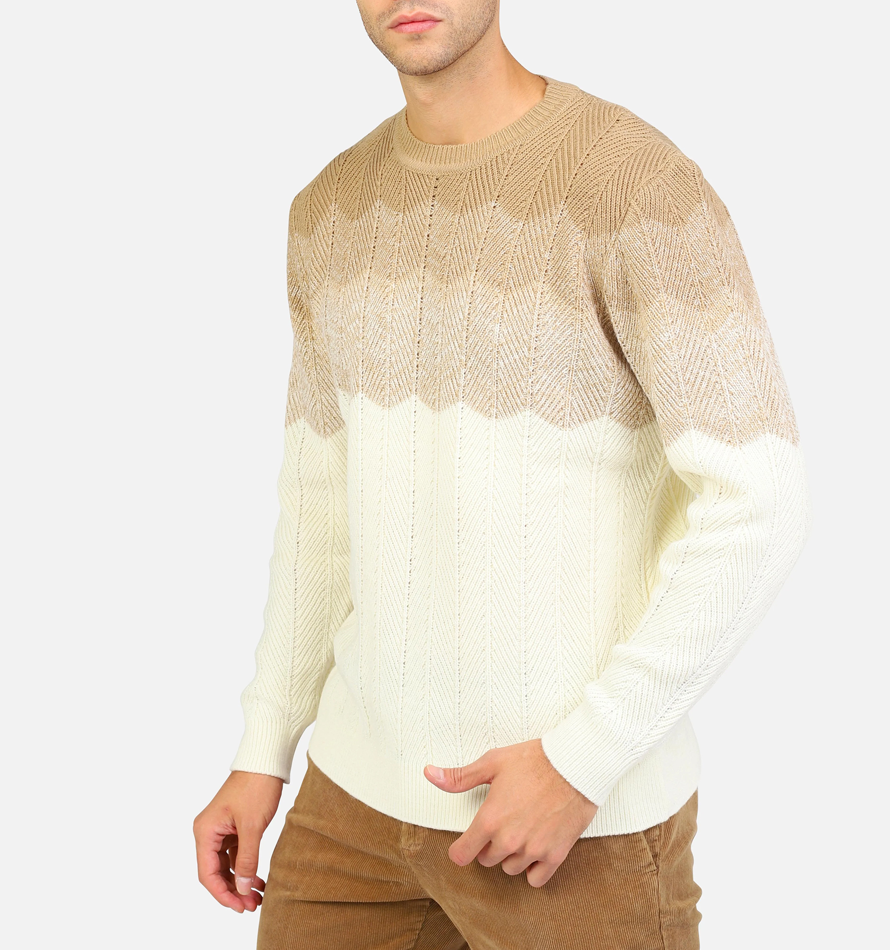 Maglione da uomo Markup articolo MK790063, realizzato in morbido filato misto lana con lavorazione sfumata nei toni del beige e panna. Modello girocollo, con vestibilità confortevole e finiture a costine su collo, polsini e fondo. Perfetto per un look casual ma curato, ideale nelle giornate più fredde.