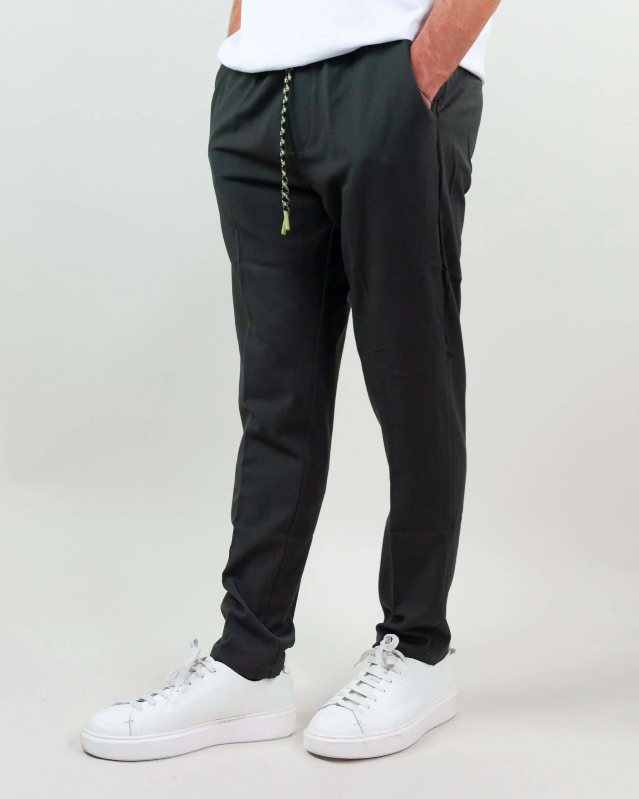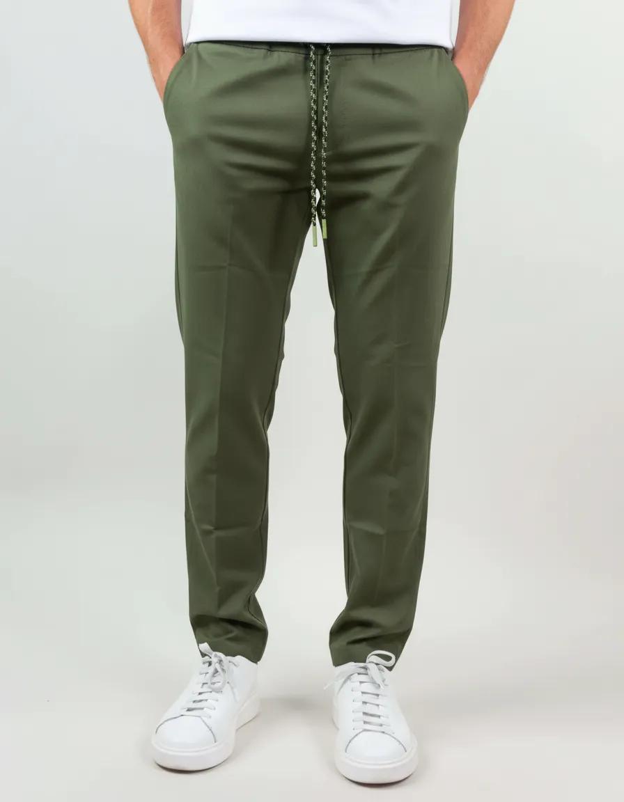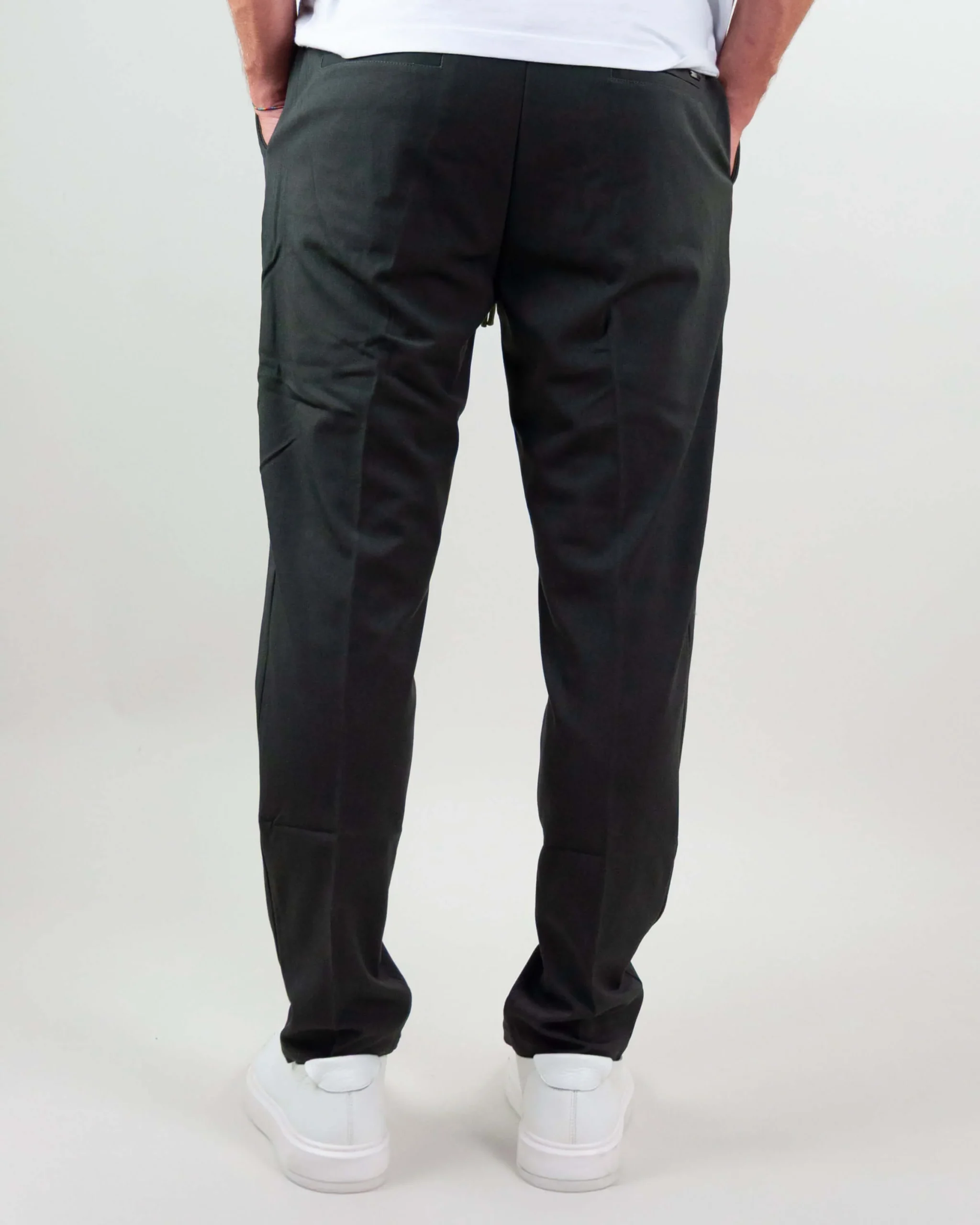 Pantalaccio uomo in tessuto tecnico di poliviscosa, morbido ed elasticizzato, con gamba dritta e piega centrale per un look moderno e versatile. In vita presenta una comoda coulisse regolabile a contrasto e tasche laterali, completato da tasche posteriori a filetto. Perfetto per outfit casual e contemporanei con un tocco di eleganza sportiva.
