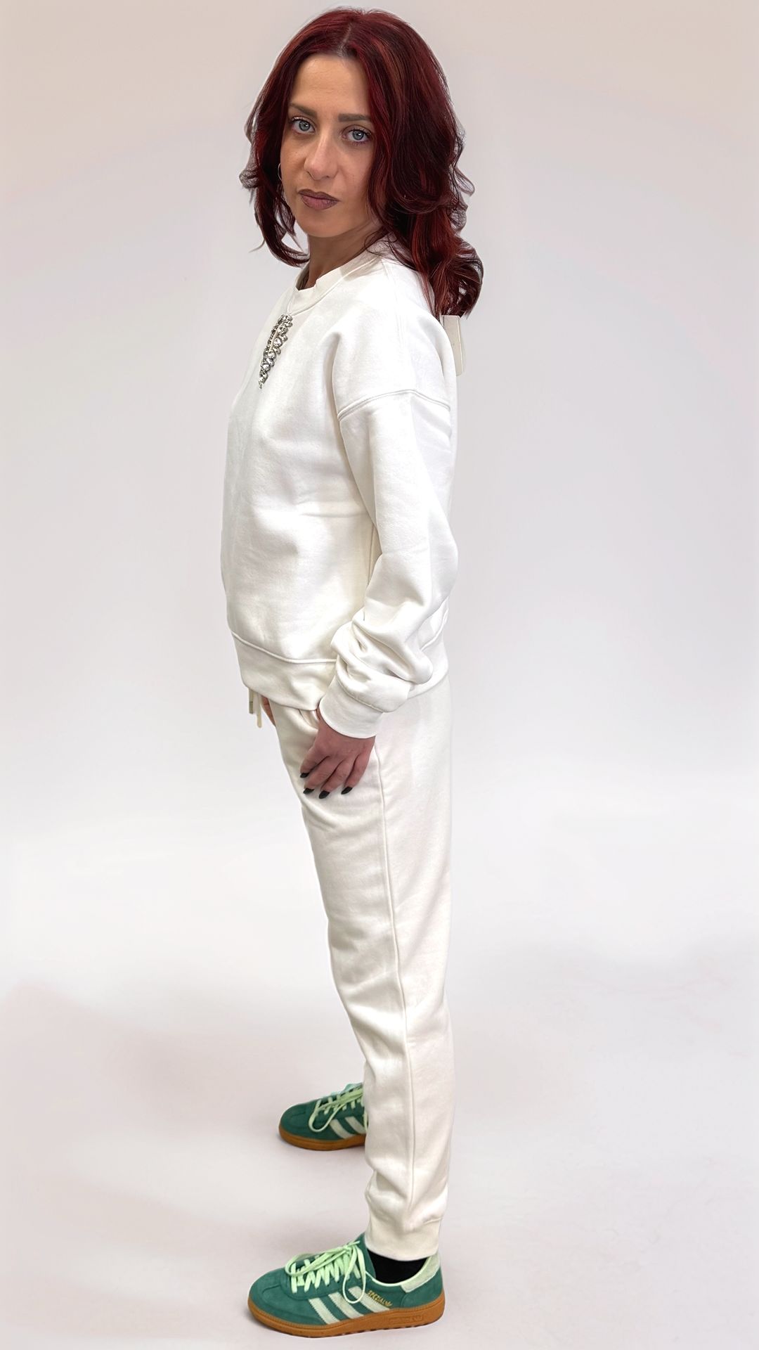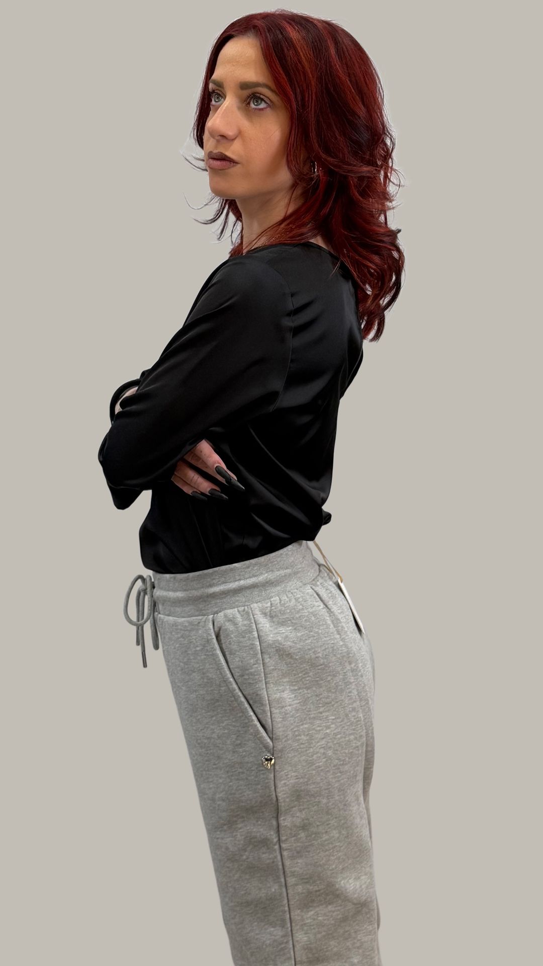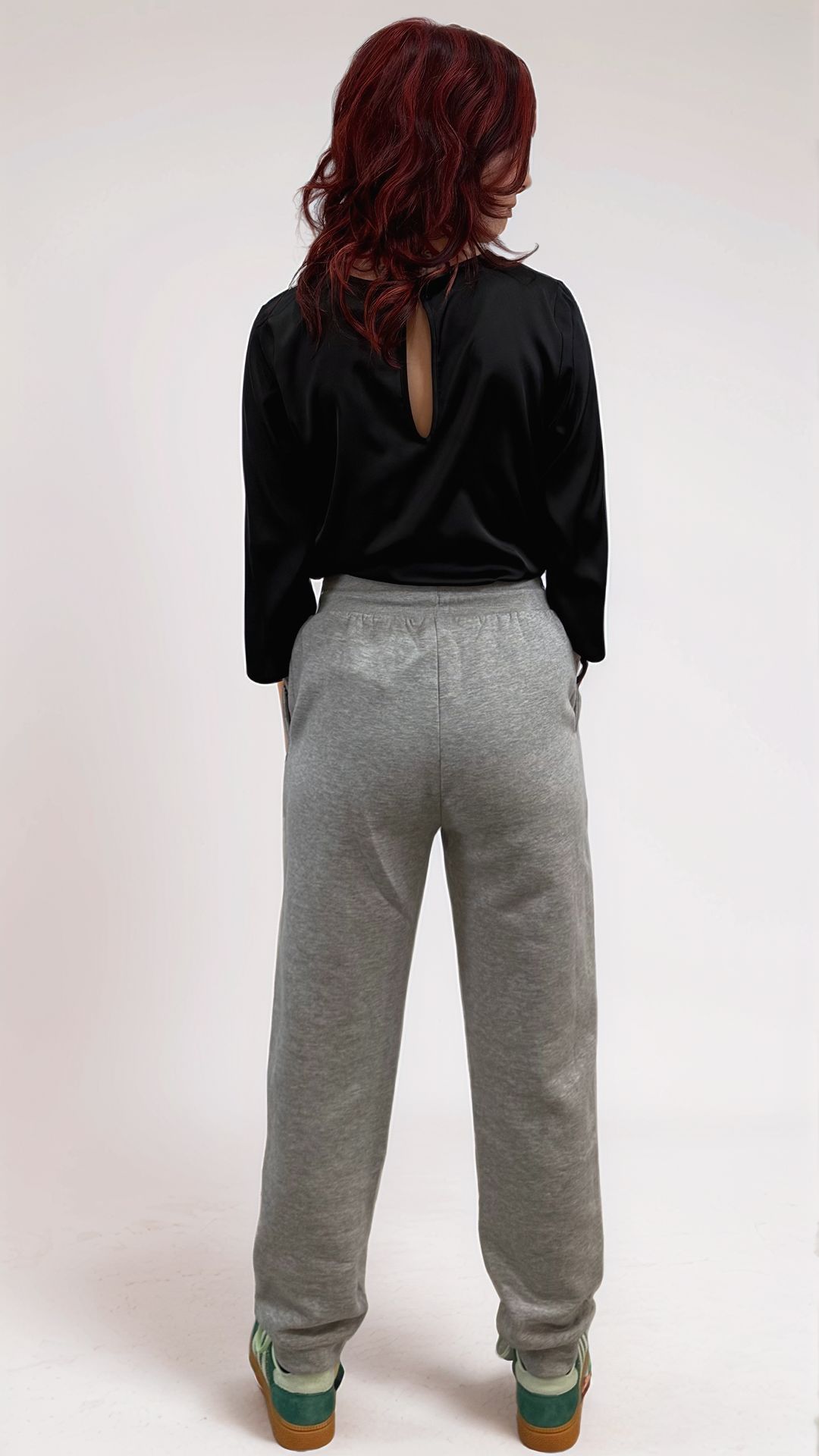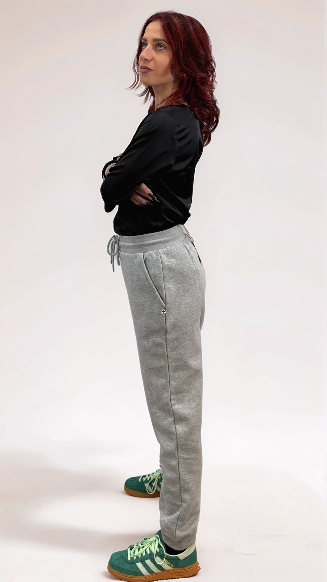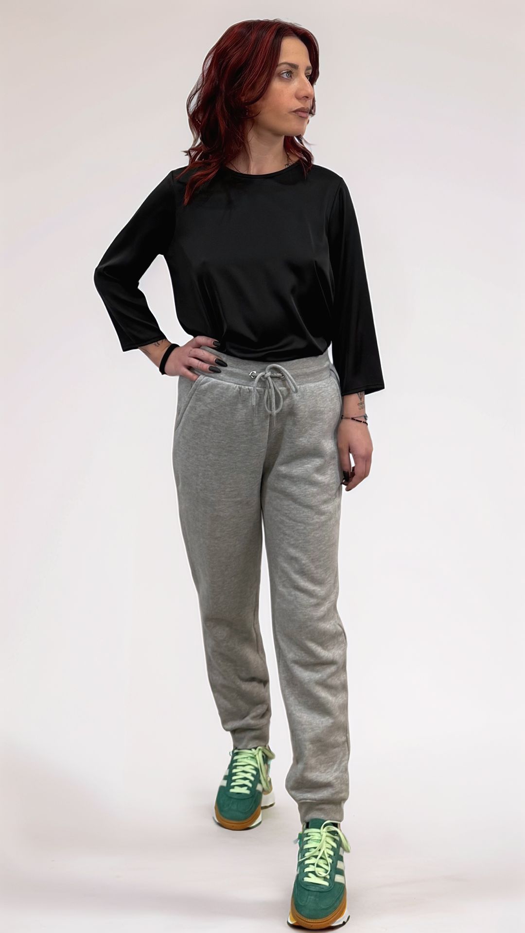 Presenta vita elasticizzata con coulisse regolabile, tasche laterali e fondo gamba con polsino elasticizzato che valorizza la silhouette mantenendo un taglio pulito e moderno.