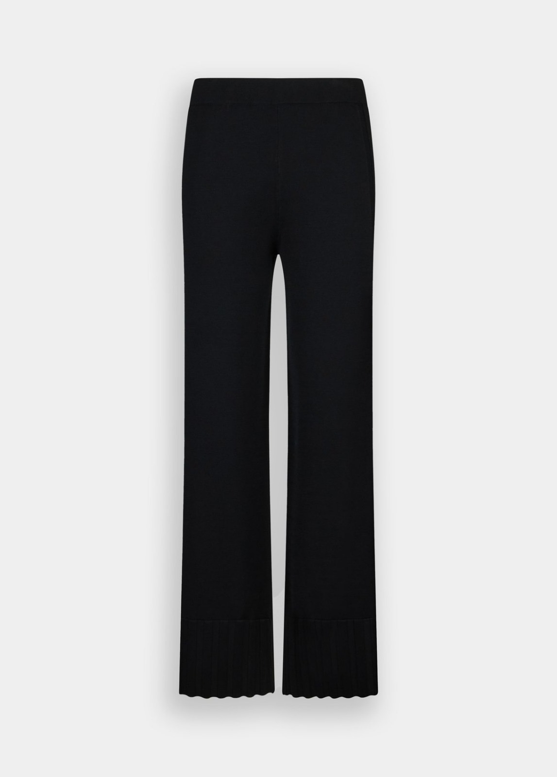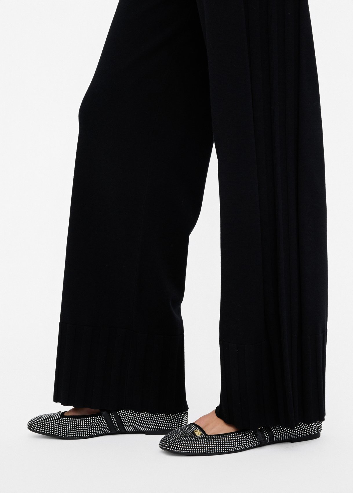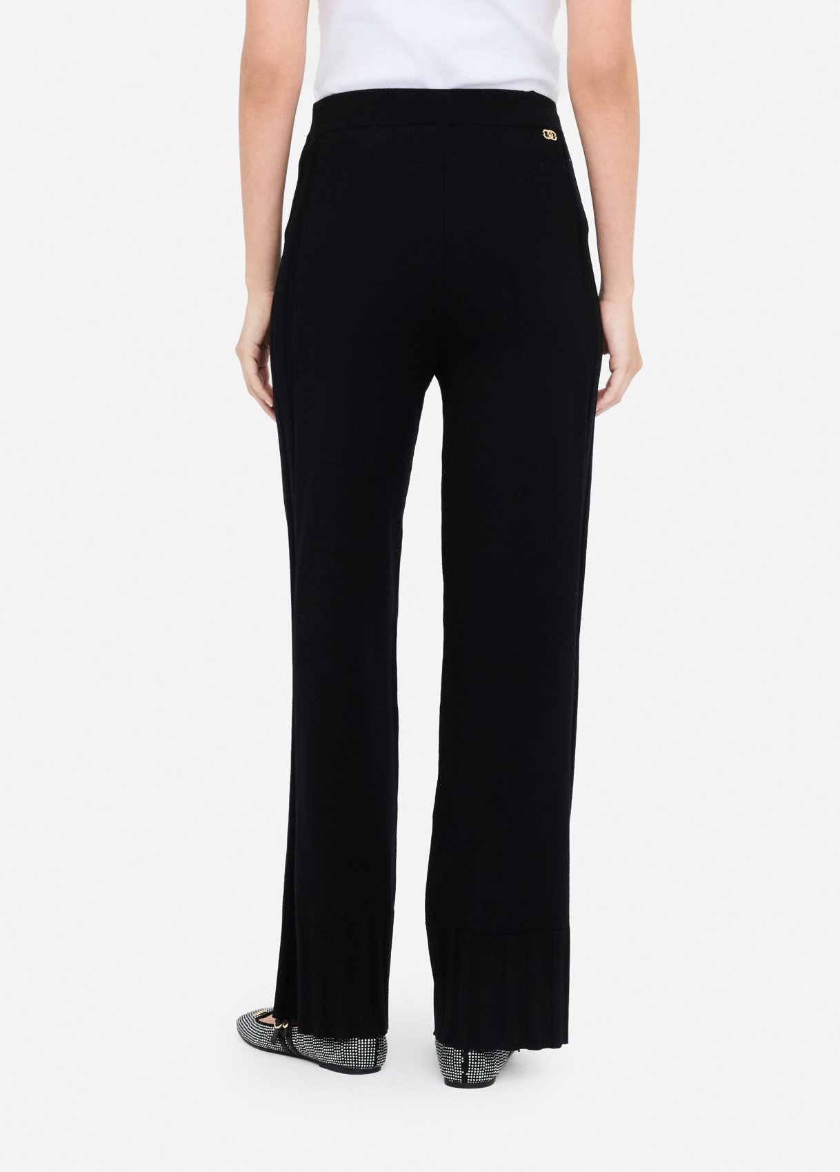 Pantaloni neri ecosostenibili realizzati in maglia di misto viscosa, morbidi e confortevoli. Il design è valorizzato da una raffinata lavorazione a righe sui lati e da un pratico cintone elastico in vita che assicura una vestibilità impeccabile. Completa il modello il logo in metallo sul retro, dettaglio iconico Liu Jo. Un capo versatile e chic, perfetto per look casual o più ricercati.