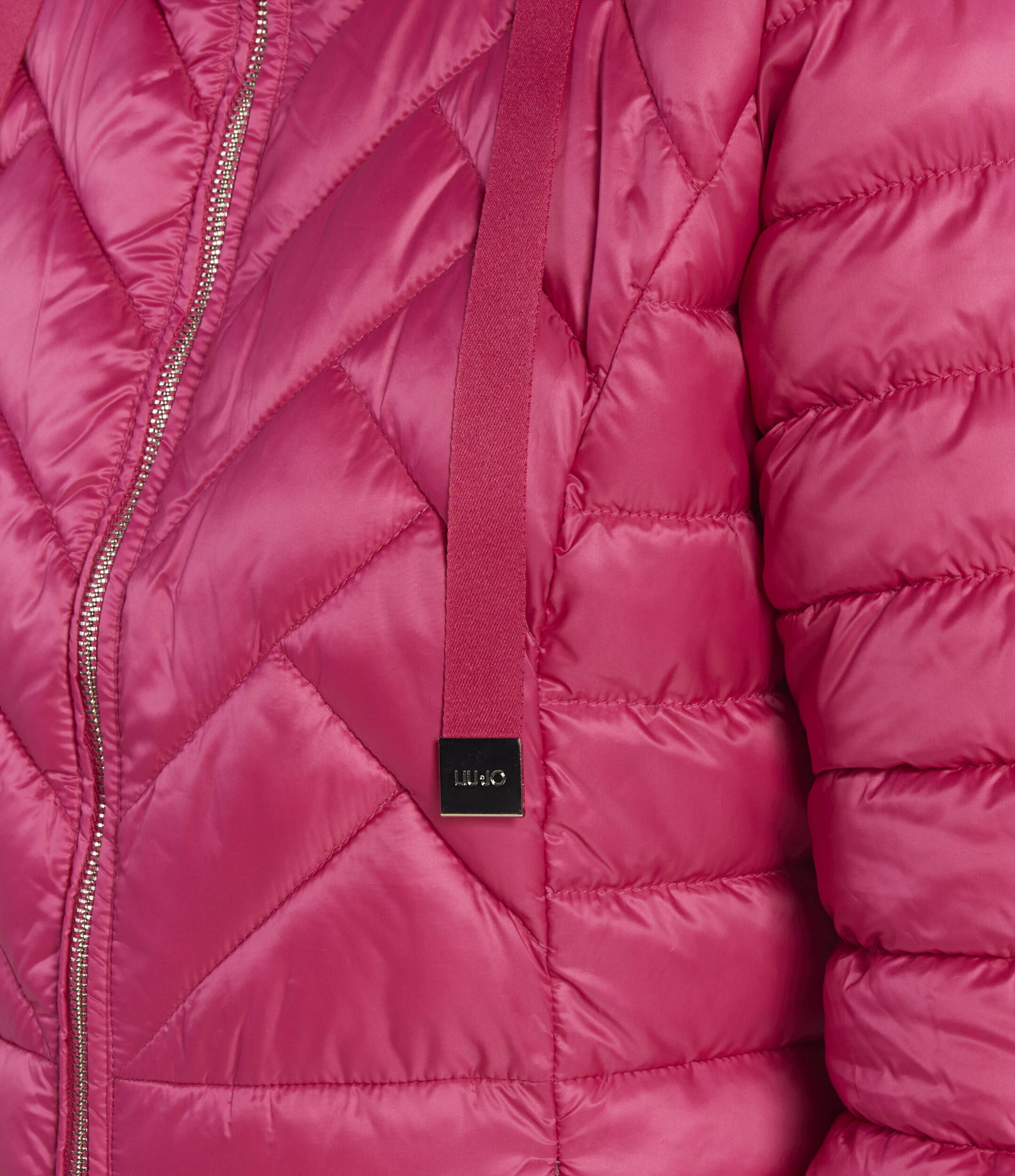 Piumino corto da donna Liu Jo Sport dal design moderno e femminile, realizzato in tessuto tecnico lucido color rosa. Presenta trapuntatura a righe orizzontali con motivo a punta sul petto, chiusura frontale con zip metallica e pratico cappuccio con coulisse impreziosita da finalini logati. L’interno è foderato in poliammide per assicurare comfort e leggerezza, mentre l’imbottitura in poliestere garantisce un piacevole calore senza appesantire la figura.