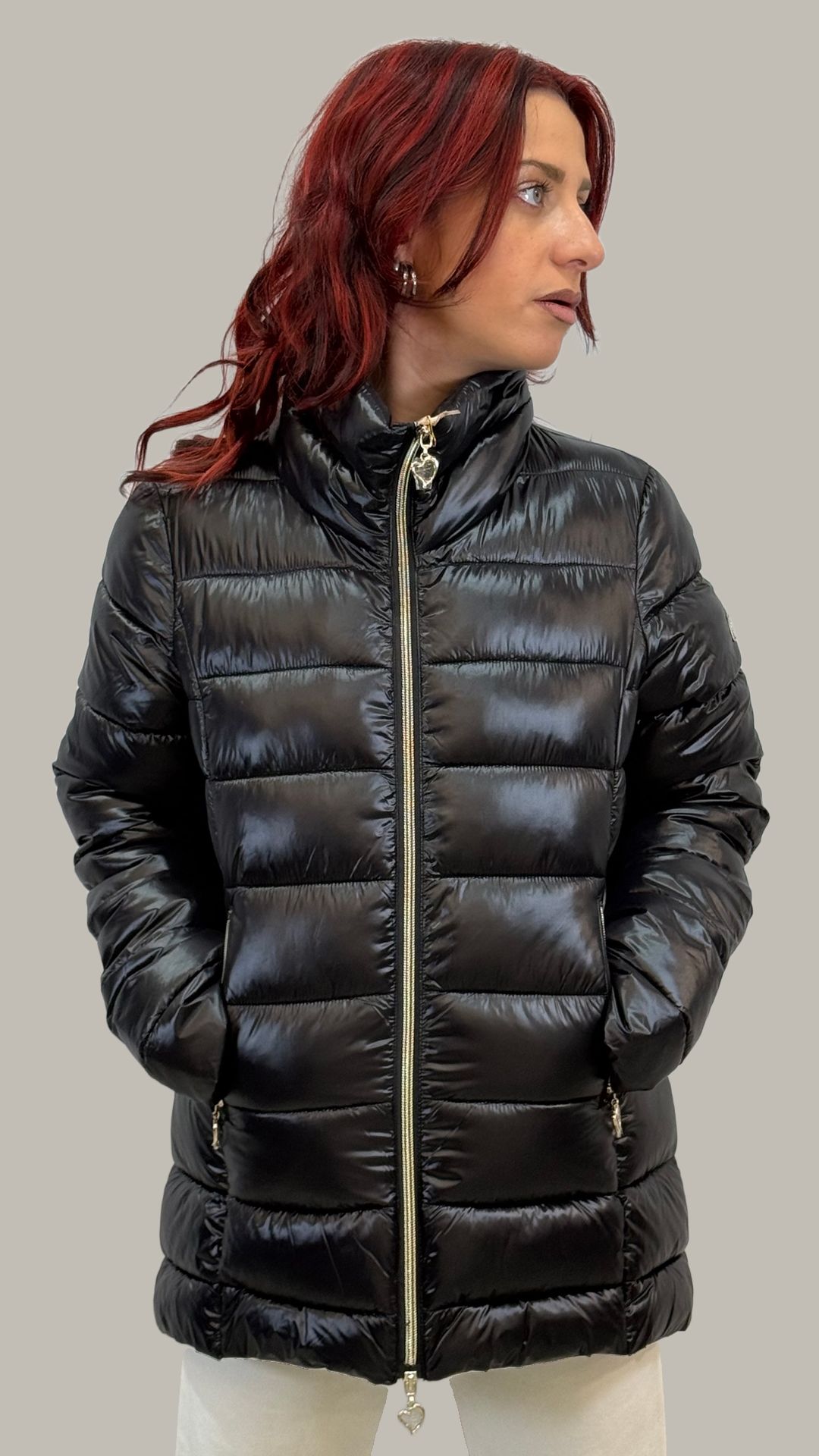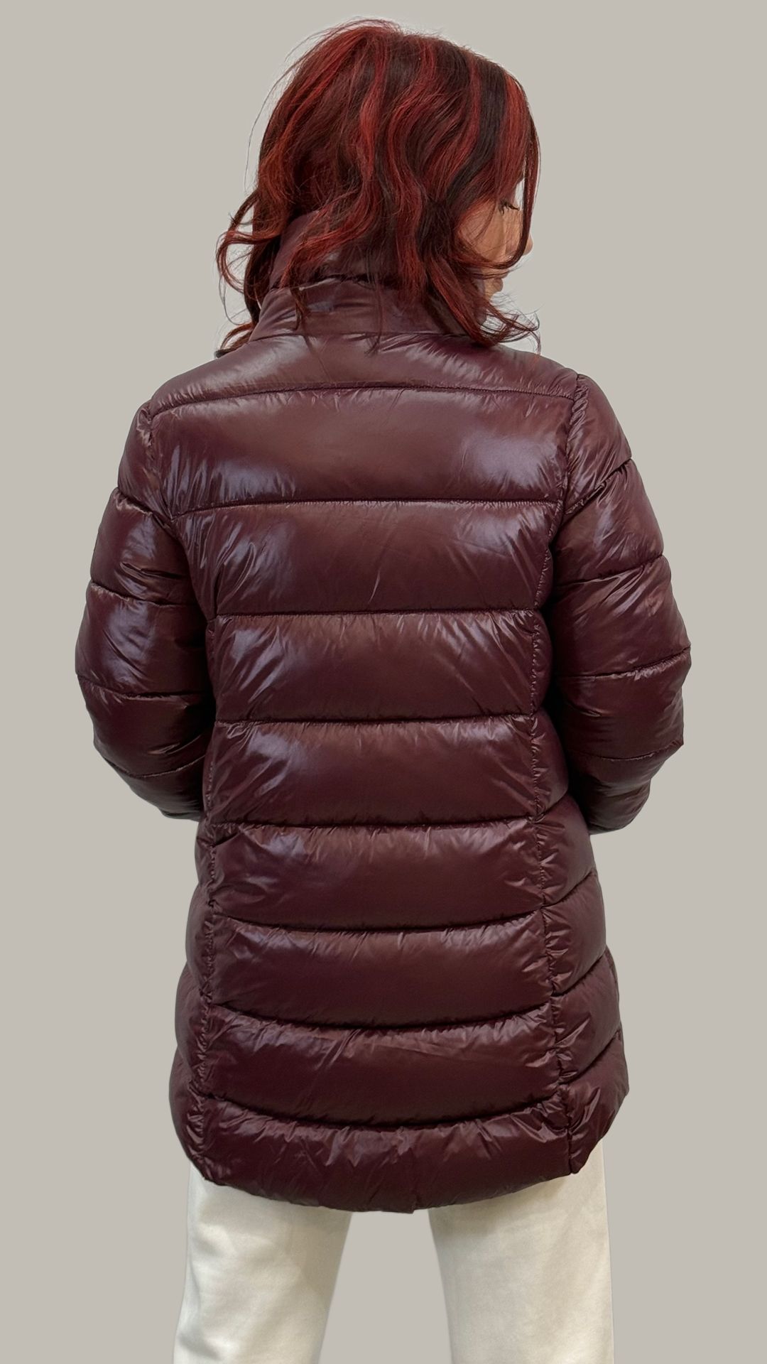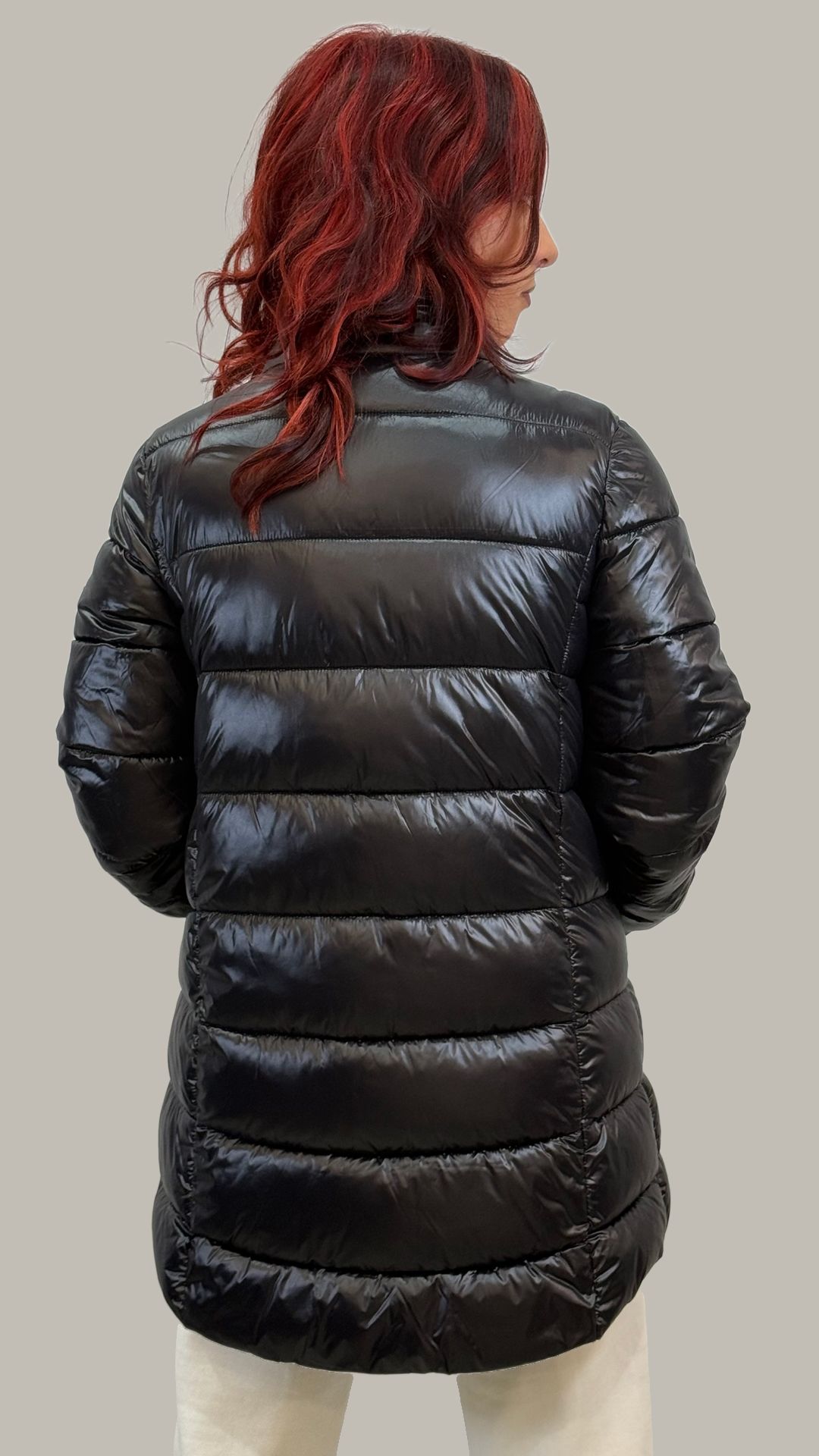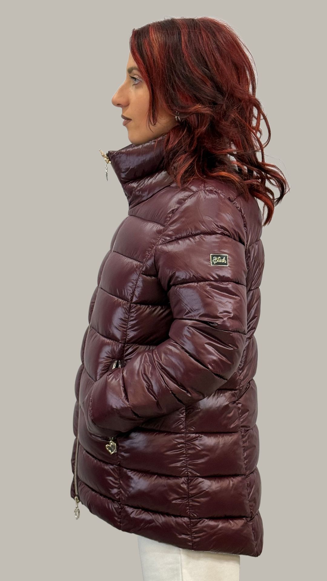 Piumino donna midi Blash in nylon lucido, dal design trapuntato e silhouette leggermente sfiancata. Dotato di zip centrale dorata a doppio cursore e tasche laterali con chiusura a zip. Collo alto avvolgente che garantisce calore e protezione durante la stagione fredda. Un capo versatile e confortevole, perfetto per look casual o più raffinati.