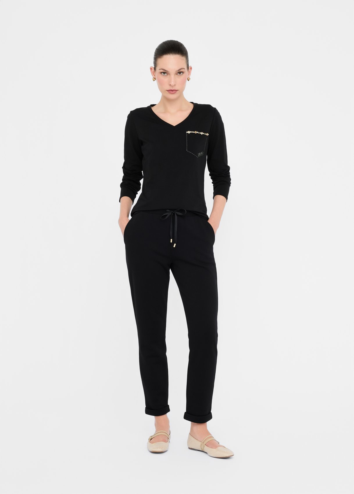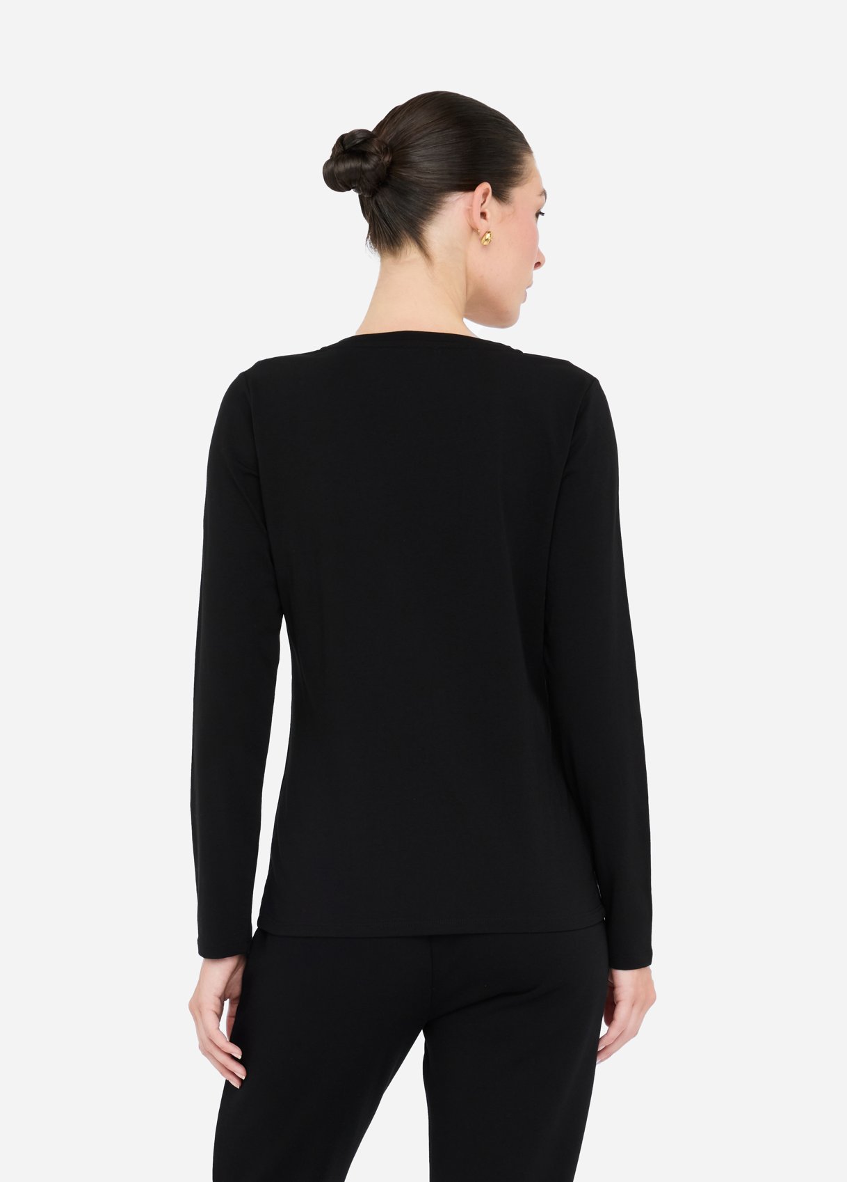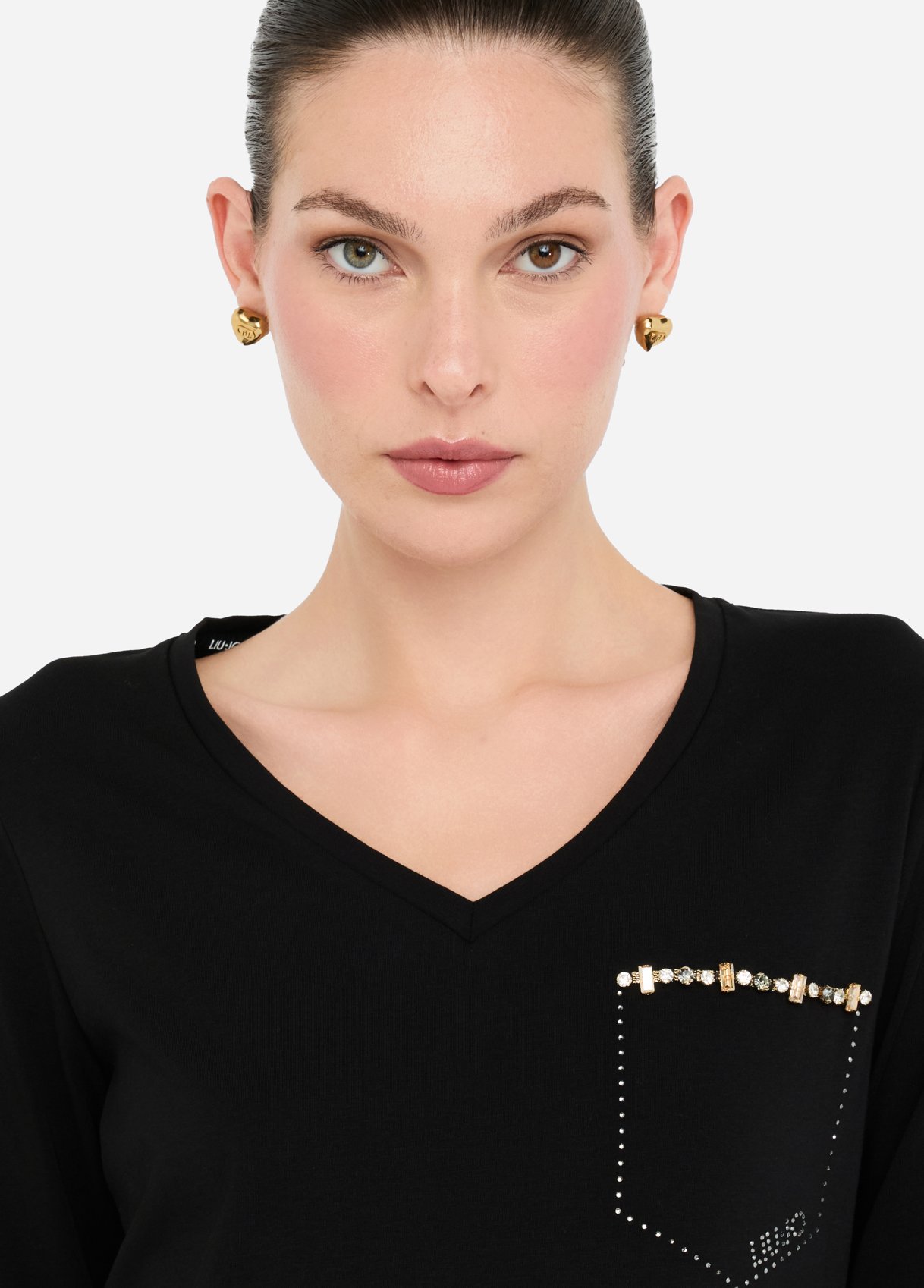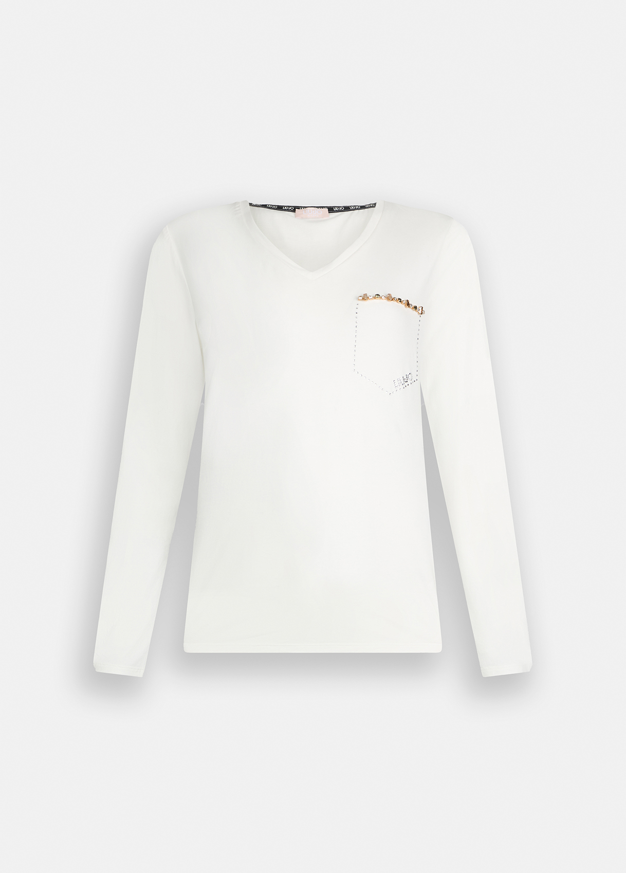 T-shirt ecosostenibile Liu Jo Better, realizzata in jersey di cotone stretch per un comfort ottimale. Il modello si distingue per lo scollo a V e le maniche lunghe, impreziosito da luminosi strass applicati a formare il logo sul petto. Un capo versatile e raffinato, perfetto per valorizzare i tuoi outfit casual-chic con un dettaglio scintillante.