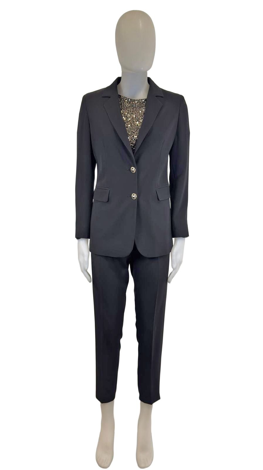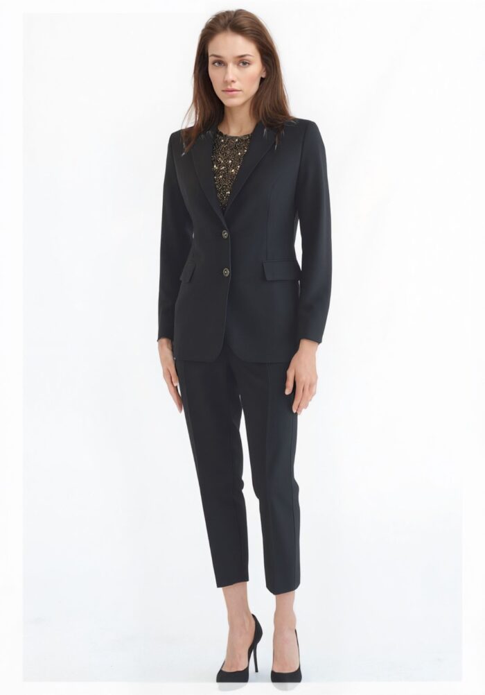 Elegante tailleur da donna della Romi-Hรฒ. Composto da giacca con chiusura a due bottoni e pantalone dal taglio dritto alla caviglia, รจ realizzato in tessuto stretch (95% poliestere, 5% elastan) per offrire comfort e una vestibilitร impeccabile. Ideale per look formali, cerimonie o occasioni di lavoro.